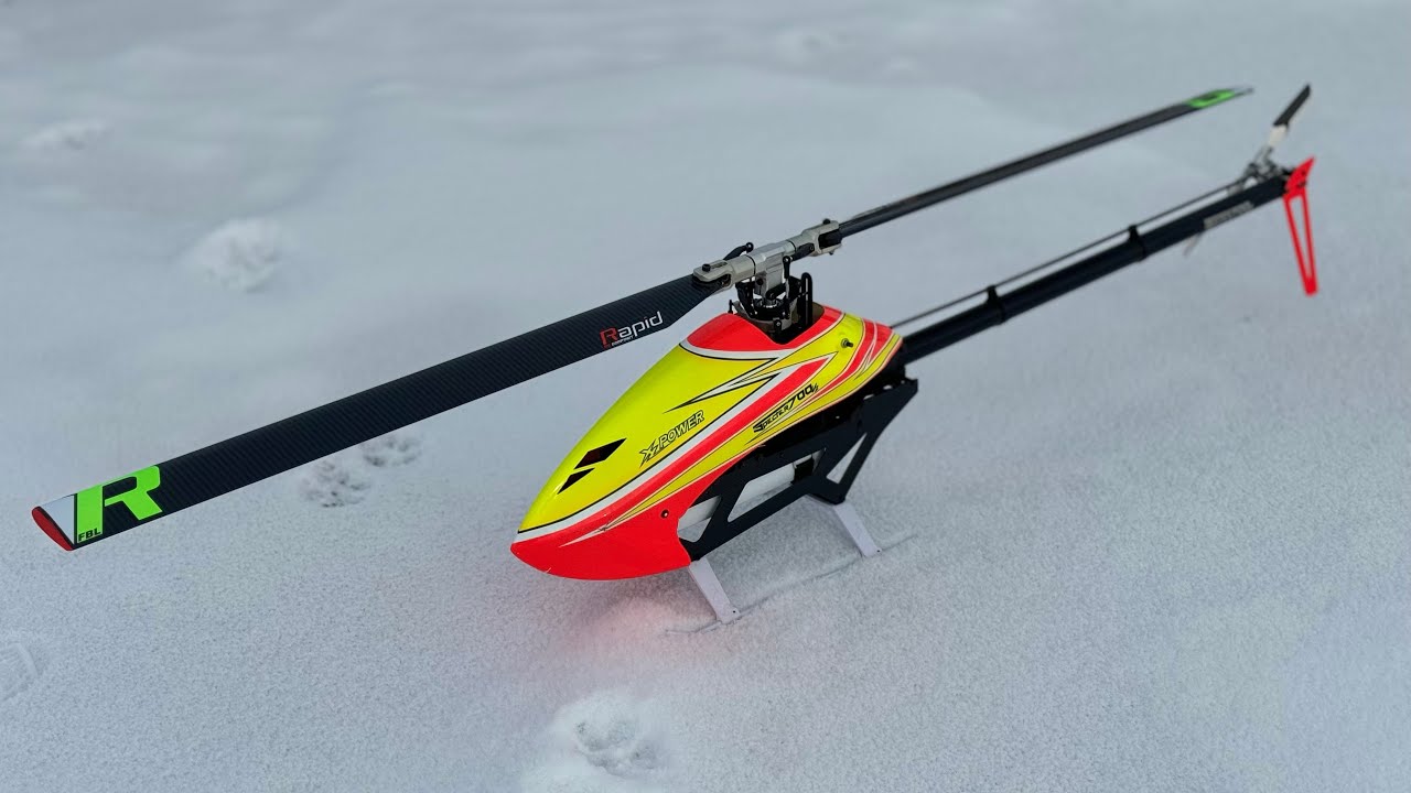 Normal fliege ich den Piuma ja 12S. Ich hab im Winter kein Bock auf das 12S Geraffel. Daher habe ich mir einen Align 700MX mit 770KV machen lassen damit ich den auch mit 8S fliegen kann. Mit dem Xnova 4025-560 war mir das dann doch bissl zu mau und zu wenig Drehzahl. Der verbaute Aureus 105HVT ist zwar nicht ideal dafür, macht das aber prima mit.