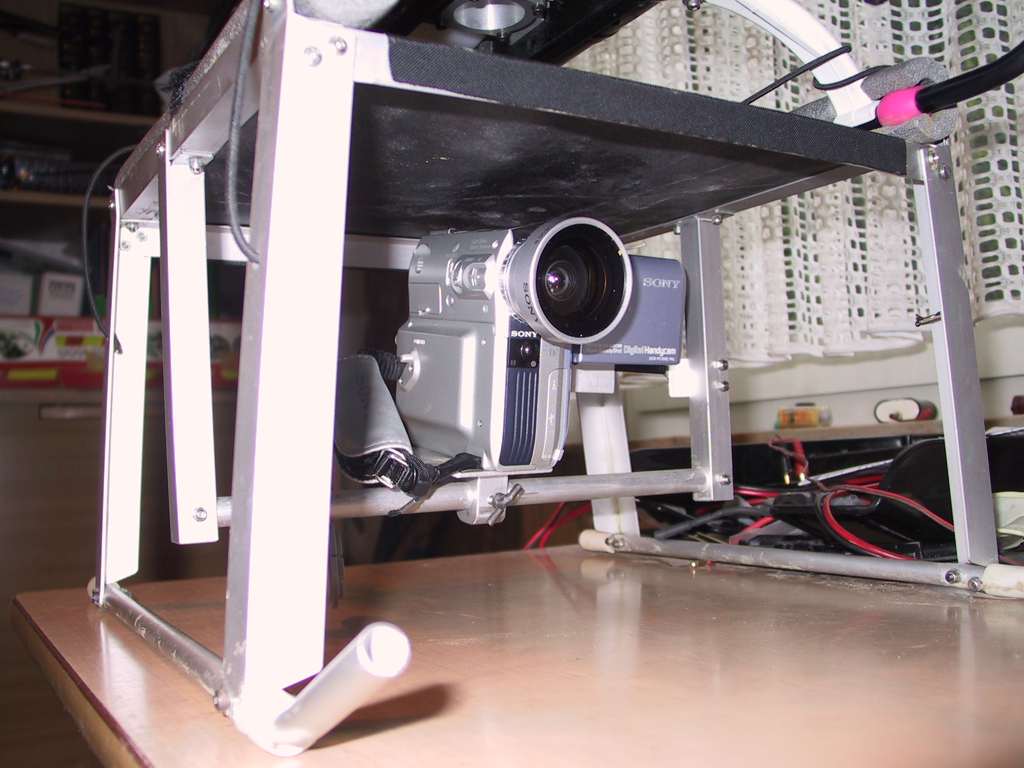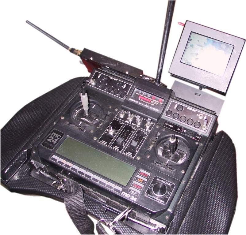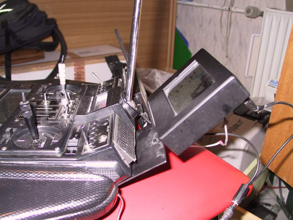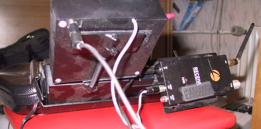 Links oben im Bilder der Empfänger, mit Klett befestigt. Der Monitor ist mit einem beweglichen Arm vom Ministativ an einer Kunststoffplatte, die ich zwischen Fernbedienung und Pult schiebe. Die Stromversorgung kommt aus einem Akkupack unter der rechten Handauflage.
