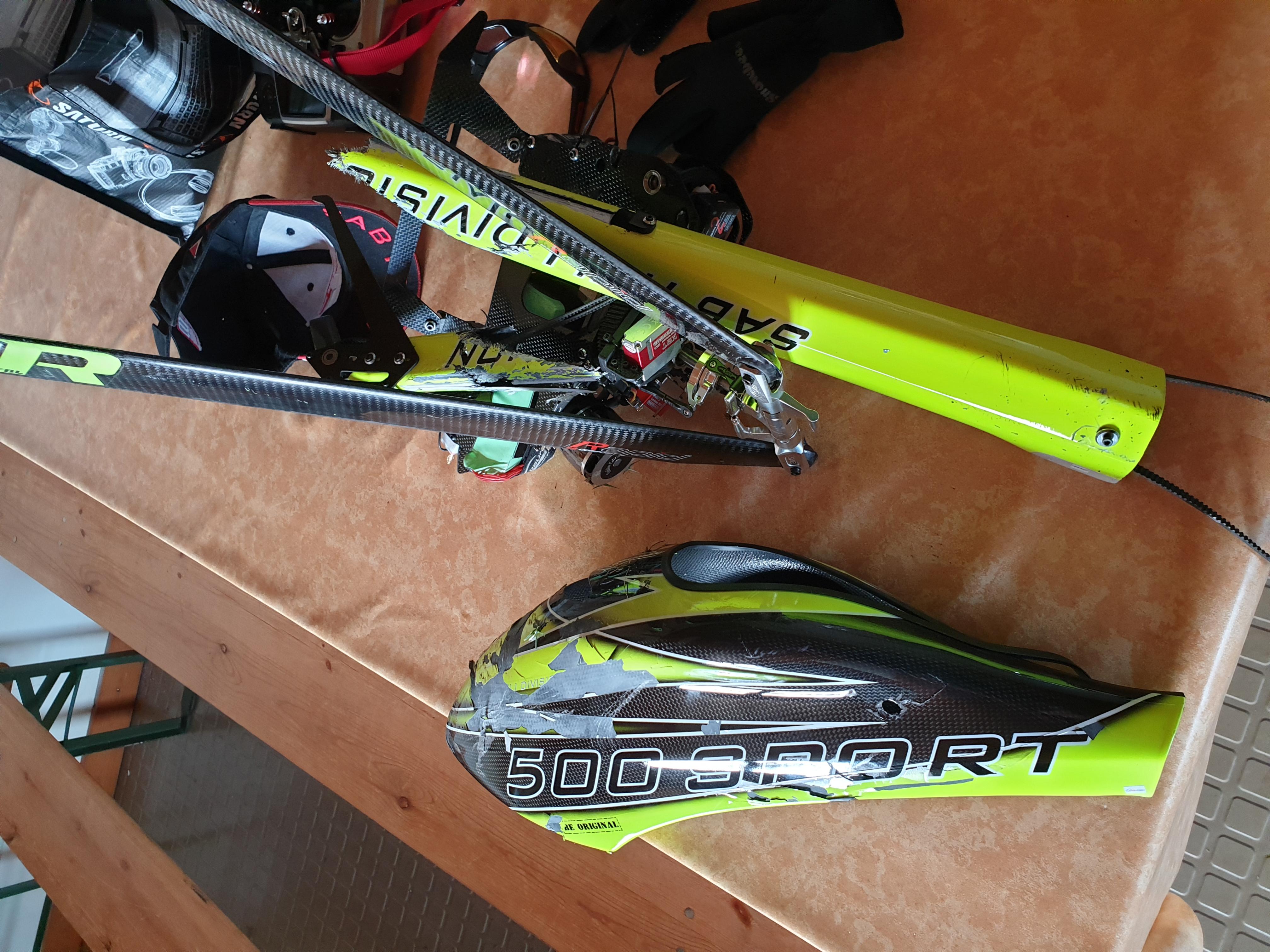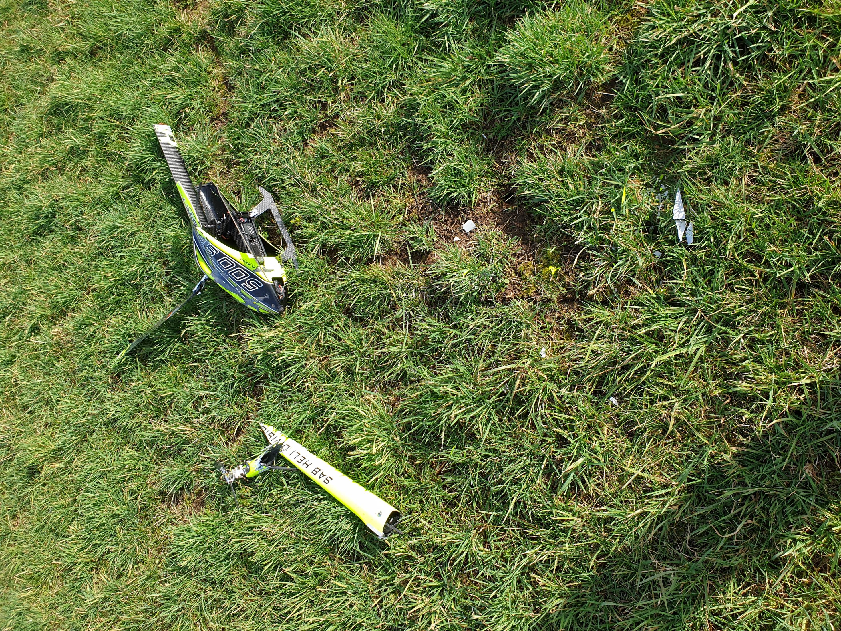 der Boom hat sich schön gelöst beim crash und ist bis auf die Chassisaufnahme komplett intakt. Dort hats leider fingernagelgroße Stücke herausgerissen. Denke die Schauben waren zu fest, sonst hätte es bestimmt gut funktioniert. Allerdings wär ich auch ohne Boom bei Ersatzteilpreisen über nem neuen Bausatz gelandet, und ne Reparatur war mir auch zu heikel. Ich dachte anfangs ohne Blätter lande ich bei ca. 300 Euro, es hat aber den kompletten Dom verzogen und nahezu jedes Aluminiumteil des Chassis war verbogen (inkl. kompletter Rotorkopf).