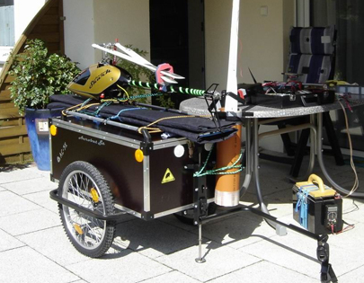 Der Roland Jumbo wird auch meine Grundlage werden. Nicht der leichteste, aber er entspricht weitestgehend den Anforderungen. Die "Dachgepäckträgerlösung" erlaubt eben auch den Transport deutlich größerer Geräte, aufgrund der Deichselposition stellt sie kein Risiko dar. Mal sehen, wie ich die Achsen auf Federung umbauen kann.
