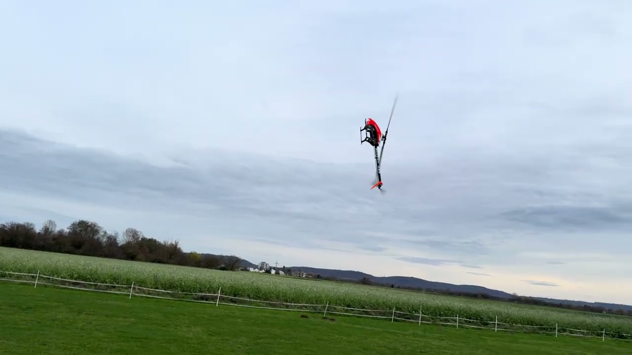 Das Heck ist unauffällig und kräftig, für die kleine Heckübersetzung auch überraschend. Generell klingt der Heli sehr gut, ist relativ leise. Auch bei schlechteren Lichtverhältnissen ist die Lage gut erkennbar.
