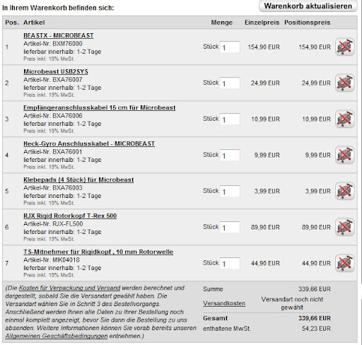 ich möchte mir kurzfristig einen T-Rex 500 Baukasten & Microbeast System & RJX Rotorkopf bestellen - soll möglichst in der nächsten Woche geliefert werden.