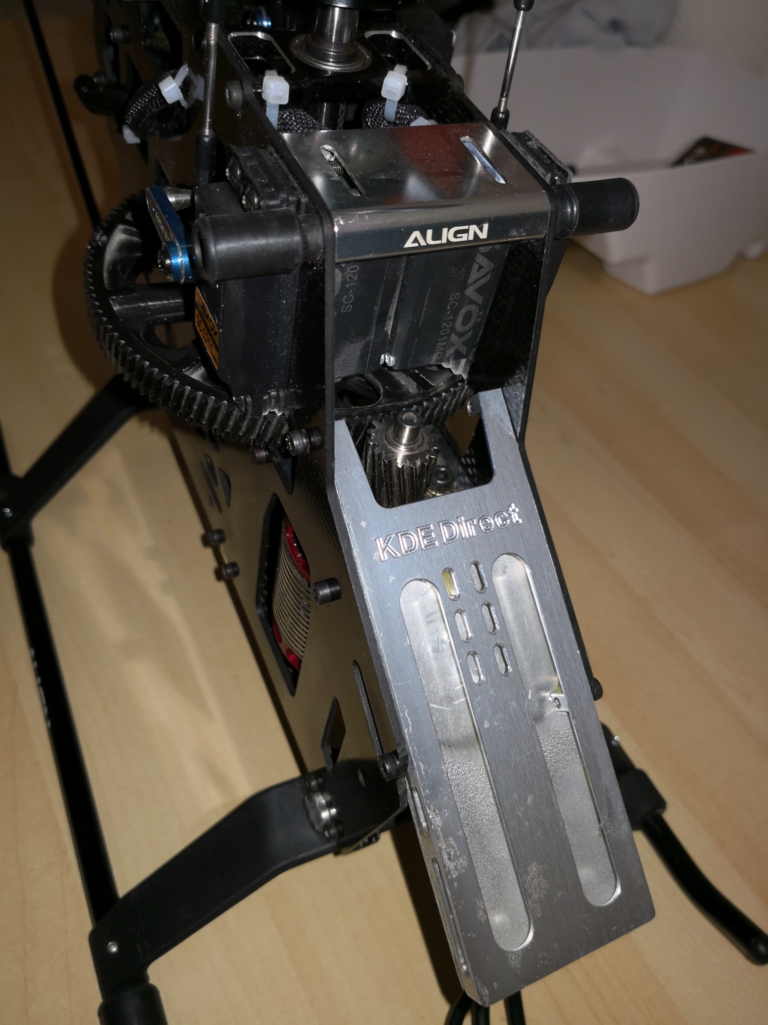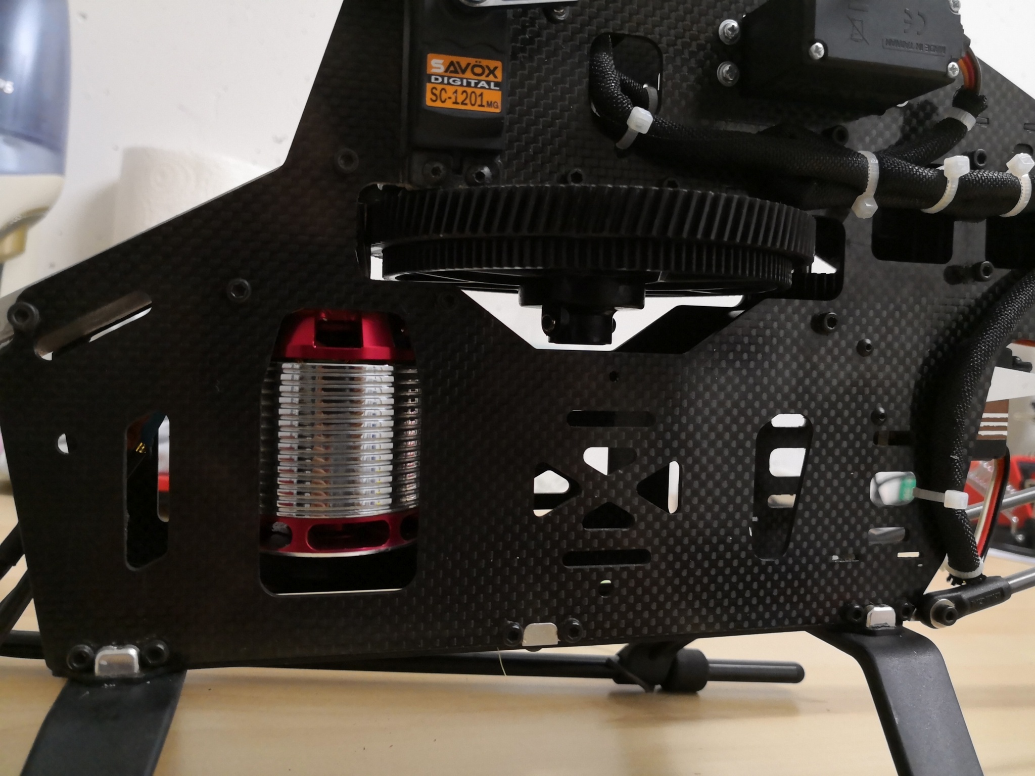 Es ist ein 600er DFC Rotorkopf mit einem 600er Carbonheckrohr. Motor ist ein RCM-BL730MX (850KV)