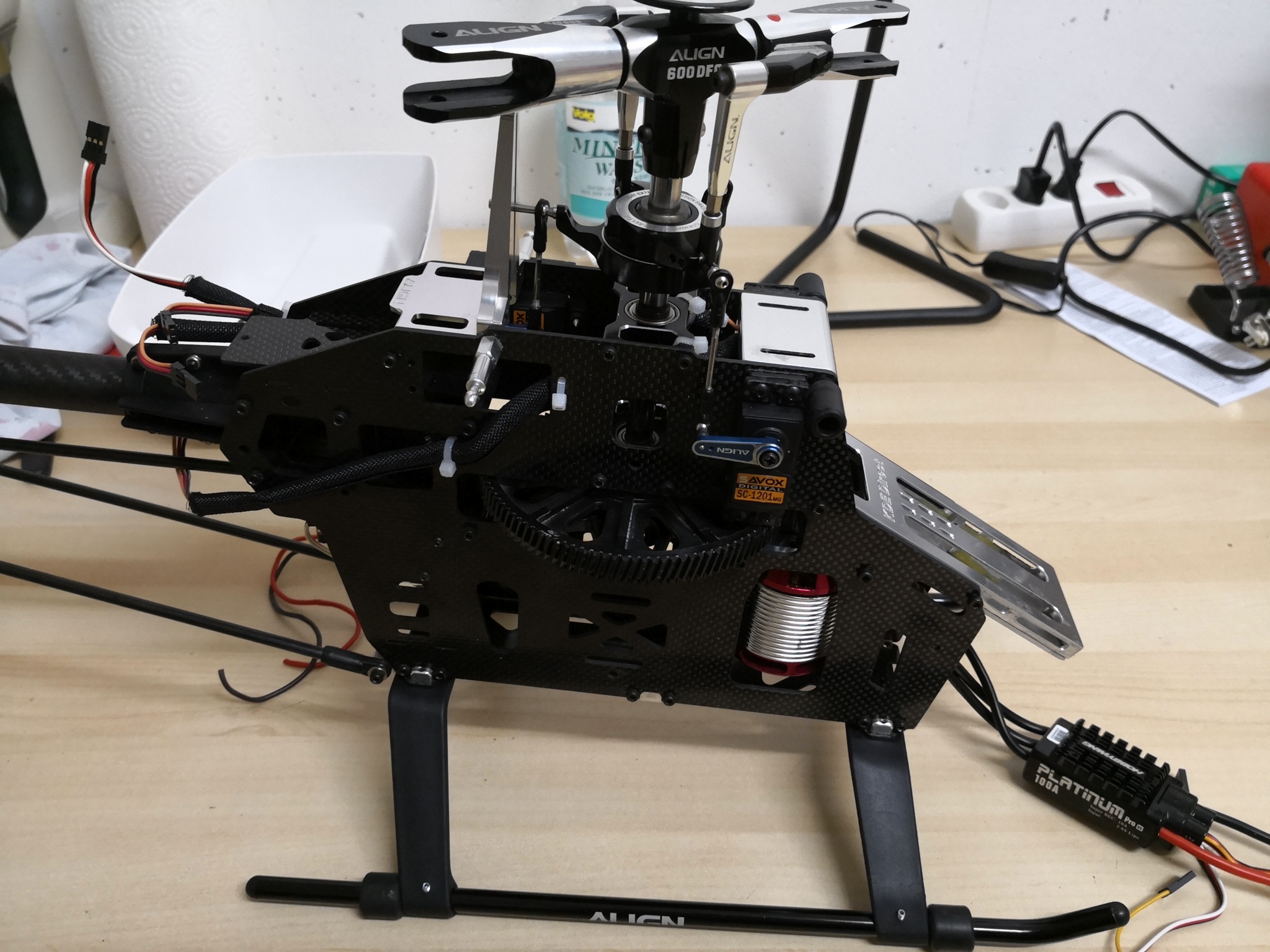 Ich habe mir einen gebrauchten 550E DFC PRO gekauft. Nun möchte ich den gerne herrichten für den Erstflug. Als erstes habe ich den Castle Talon 90 Regler rausgenommen und dem Heli einen HW 100 V3 gegönnt da ich mit dem HW schon vom 470L vertraut bin.