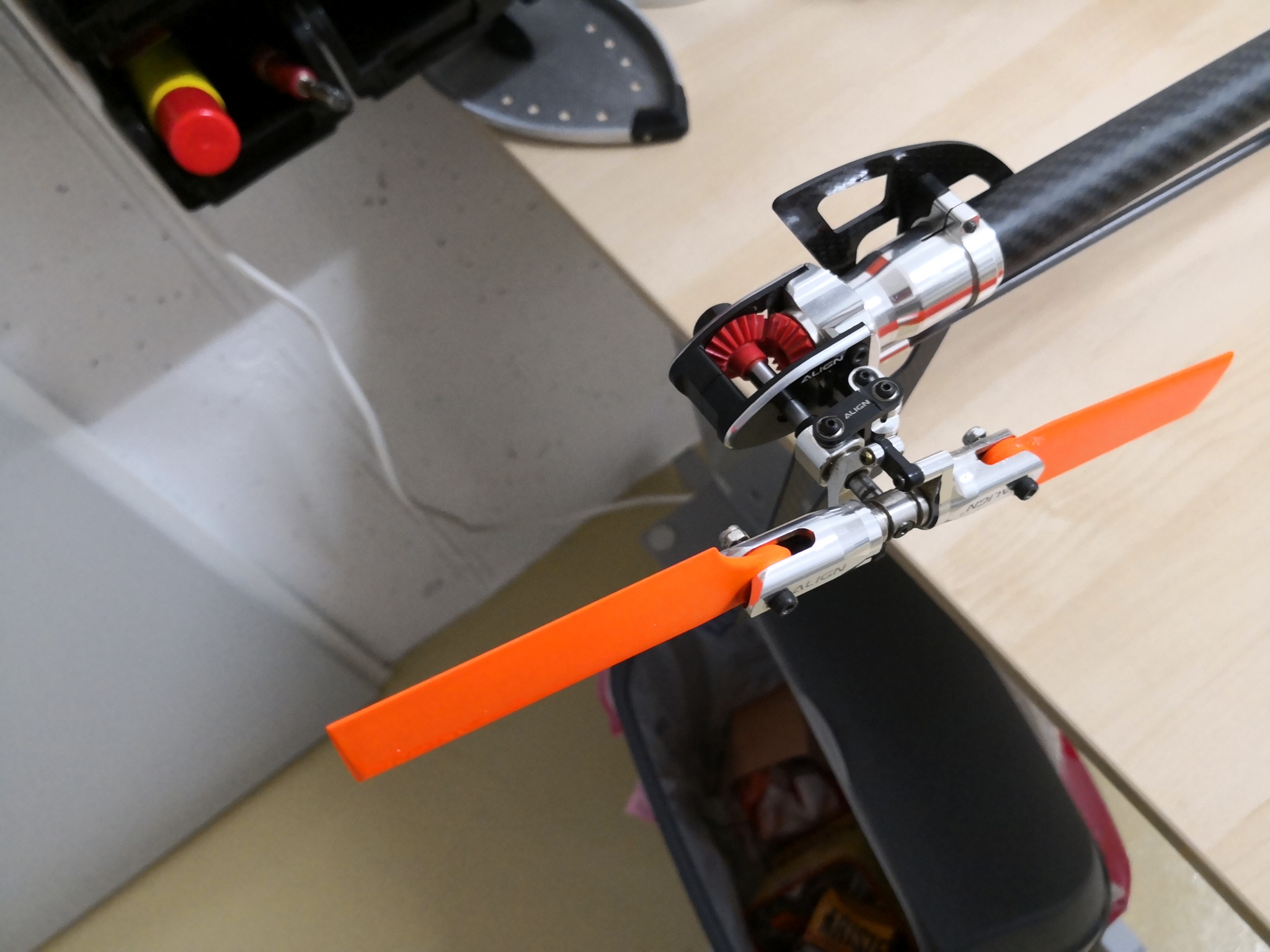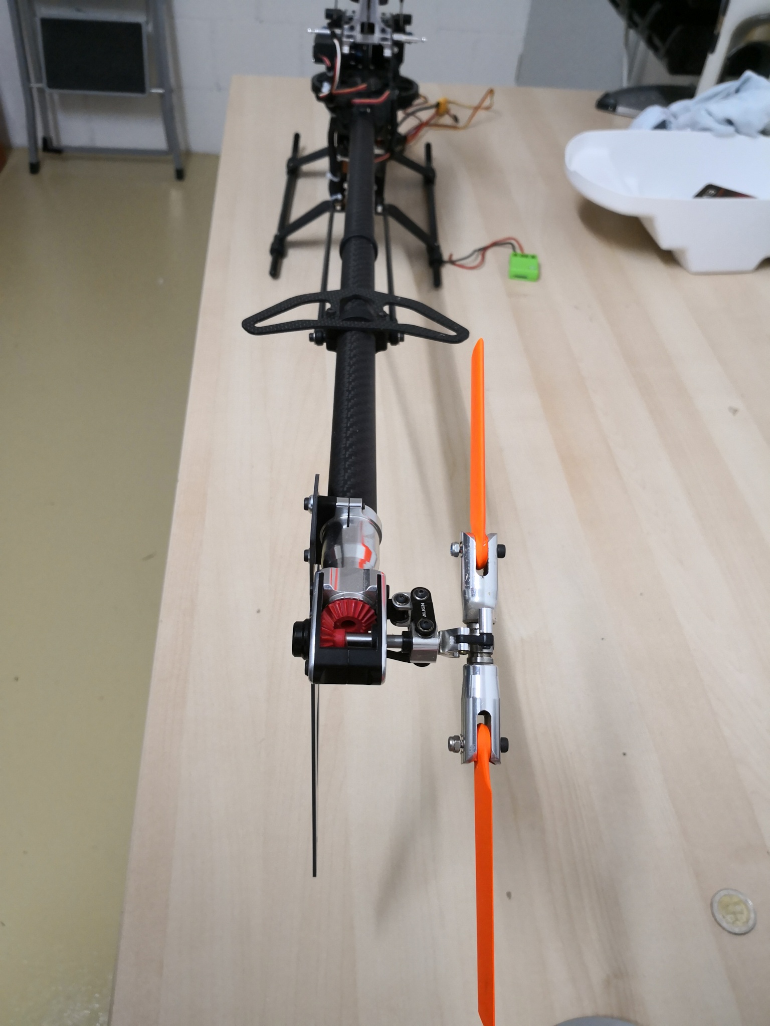 Der Heli kam mit 520er Blätter und hinten sind es ca. 88mm (gemessen von Lochmitte bis zum äusseren Rand. Beides Carbon, die Heckblätter habe ich umlackiert in der Hoffnung, dass ich die Fluglage besser erkennen werde.