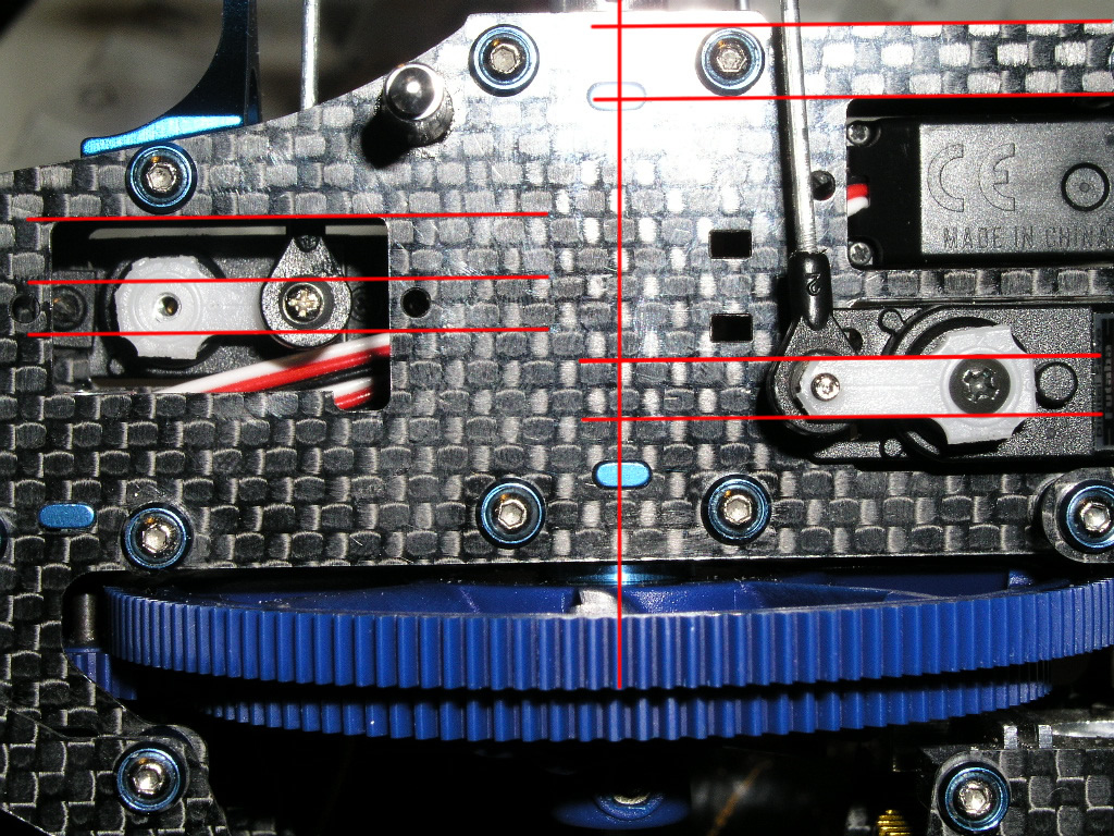 Die Hebel müssen! 90grad zur Bewegung der Taumelscheibe gestellt werden. Also in diesem Fall waagerecht. Dadurch machen sie nach oben und unten den gleichen weg (ohne Elektronische Mischung ;-) und das ist ja auch die Bewegung welche die Taumelscheibe macht.
