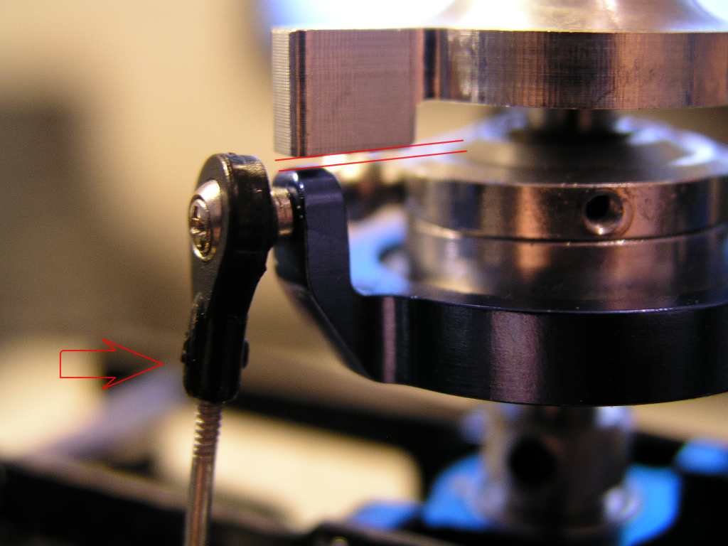 Es ist in diesem Fall nicht richtig die Servohebel parallel zum Chassis zu stellen, da die Anlenkungen nicht genau gerade zur Taumelscheibe laufen. So eingestellt, hat man immer das Problem dass die beiden Rollservos zum Nickservo unterschiedlich grosse Wege fahren. Konkret in diesem Fall etwas weniger Weg wenn die Taumelscheibe nach oben fährt und etwas mehr wenn sie nach unten fährt.