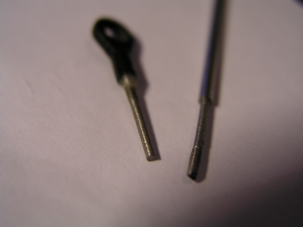 Und zwar genau bei der Verjüngung zum Gewinde. Passiert ist nix, aber - ich kann nicht 4 Wochen warten nur für eine blöde Stahlstange. Hat mir einer eine Idee wo ich eine solche am besten herbekomme? 2mm Durchmesser mit jeweils zwei M1.2 Gewinden. Oder könnte mir einer ein M1.2 Gewindeschneideisen ausborgen, das würde mir schon helfen. Ist eigentlich nur Federstahl, wenn nur diese beiden Gewinde nicht so unmöglich klein wären.