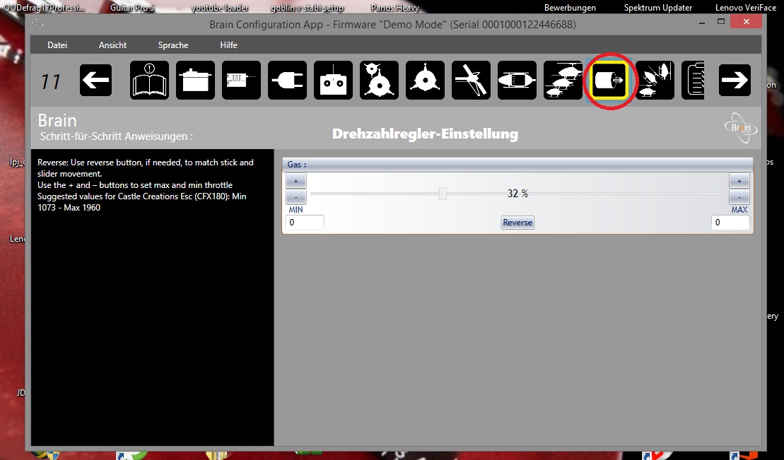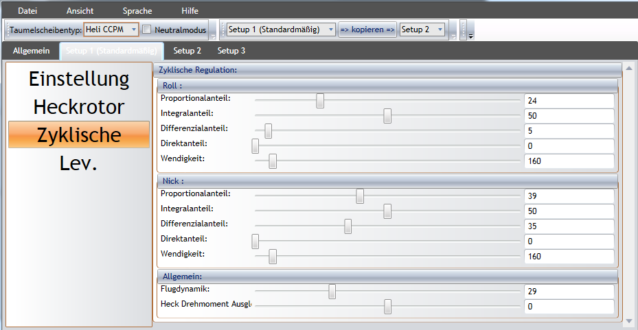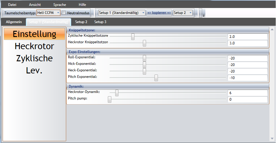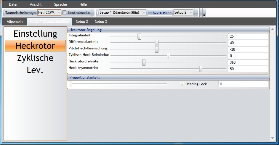 Vorab, alle Teile sind neu, zum Teil Tuningteile und ungeflogen... Ich kann aber in dieser Option nur von 500 (absolutes Minimum) bis 2500 (absolutes Maximum) einstellen. Mir kommt die Drehzahl im Flugzustand 1 viel zu Hoch vor, im Flugzustand 2 verändert sich nichts und im Flugzustand 3 geht der Motor aus. Ich habe einen Gyrowert von 3 % eingestellt (in der SW), und das Heck schwänzelt extrem hin und her (kein Wunder bei der Drehzahl). Ich komme nicht mal zum abheben... Was hast du denn in dieser Option für min. und max. eingestellt um alle Flugzustände nutzen zu können??