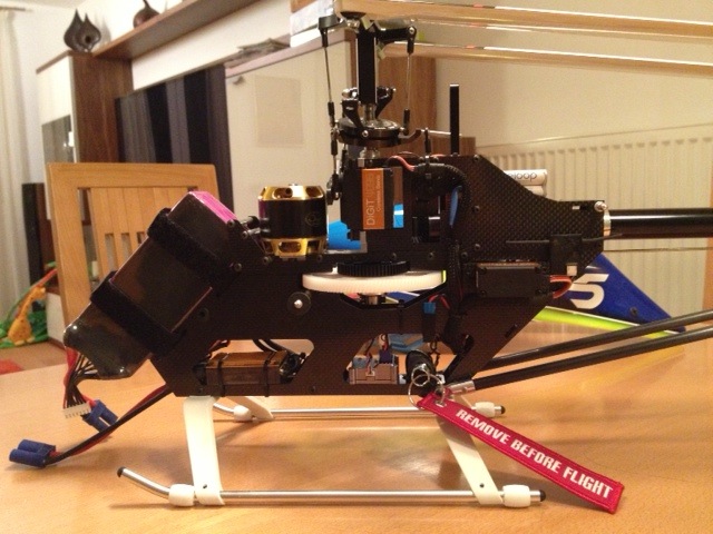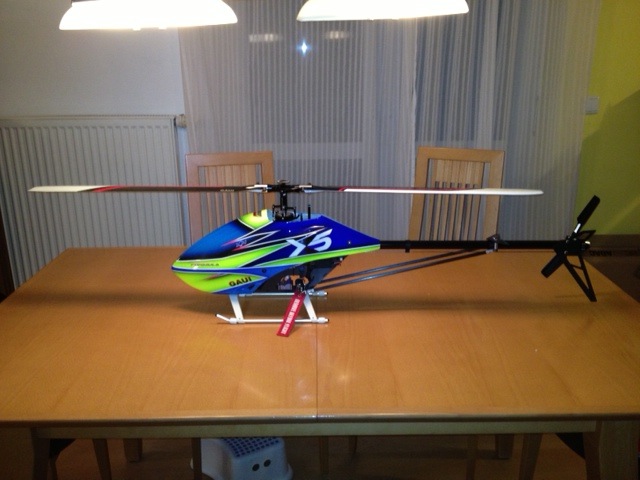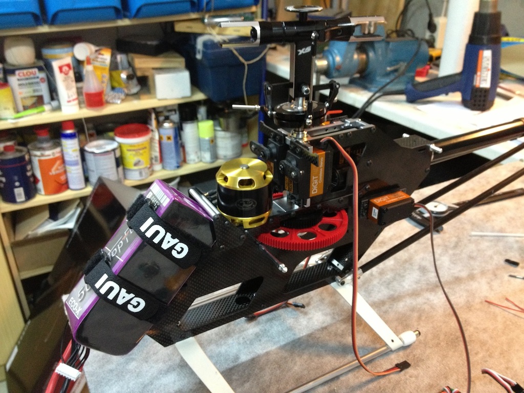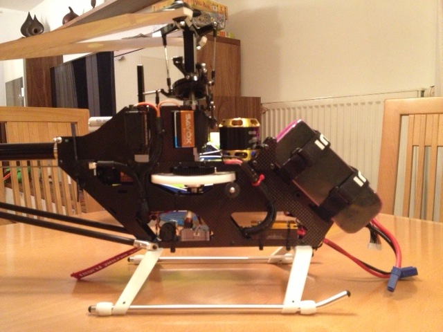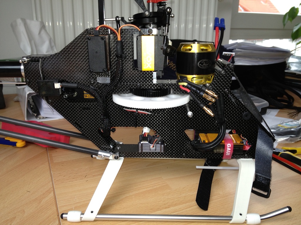Das kann ich dir erst sagen wenn ich fertig bin. Erste CG test mit der 5000mah Eco-x Akku zeigt eine ganz leicht Kopflastigkeit. CG ist Ungf. 5mm hinter der Hauptrotor. Das sollte für den HC3Sx optimal sein.