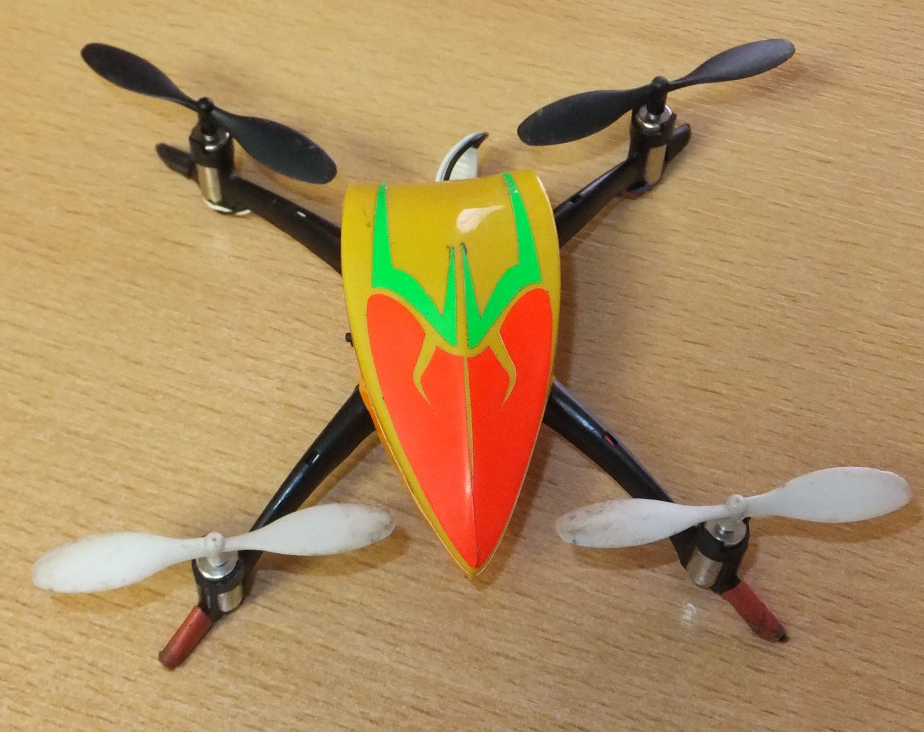 Die Ausleger des Stock-Rahmens wurden gekürzt (splittern sowieso als erstes), die Haube ist von einem dt. eBayer (stabiler, vielleicht etwas schwerer), die Props die des CG023 und die Motoren in Mischbestückung aus Blade und MMW-Mittelschnell. Auf der Devo 10 mit Deviation fliege ich fürs Cruisen im Agility-Mode eine 7-Punkt-Kurve mit -60, -35, -15, 0, 15, 35, 60 auf Nick und Roll, die schöne gleichmäßige, kontrollierbare Bewegungen erlaubt. Für etwas Akrobatik im dritten Flugzustand ist die Kurve -100, -34, -17, 0, 17, 34, 100, zusätzlich geht das Gas nicht mehr auf Null, damit die Motoren nicht während eines Flips ungewollt abschalten.