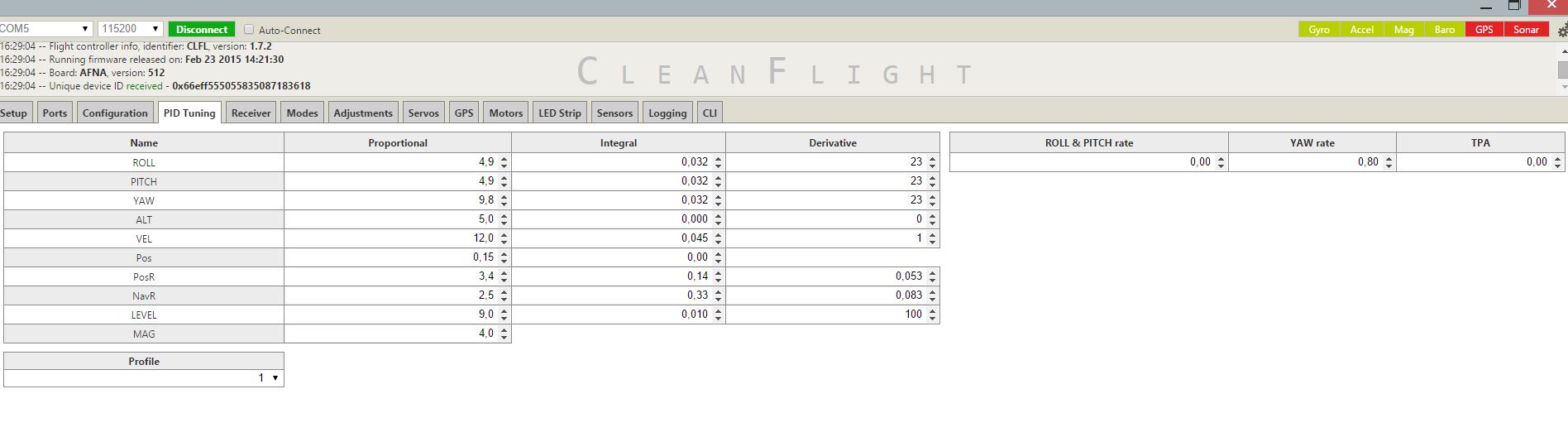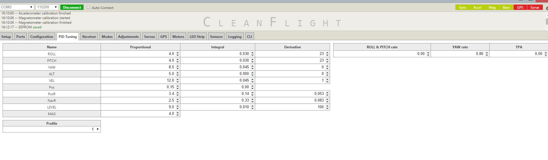 Zuerst die Standardwerte nachdem ich Cleanflight frisch aufgespielt hatte.