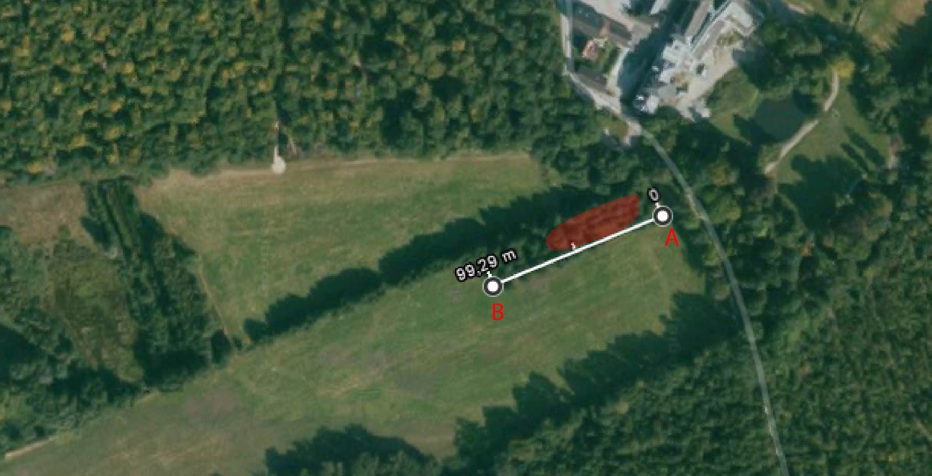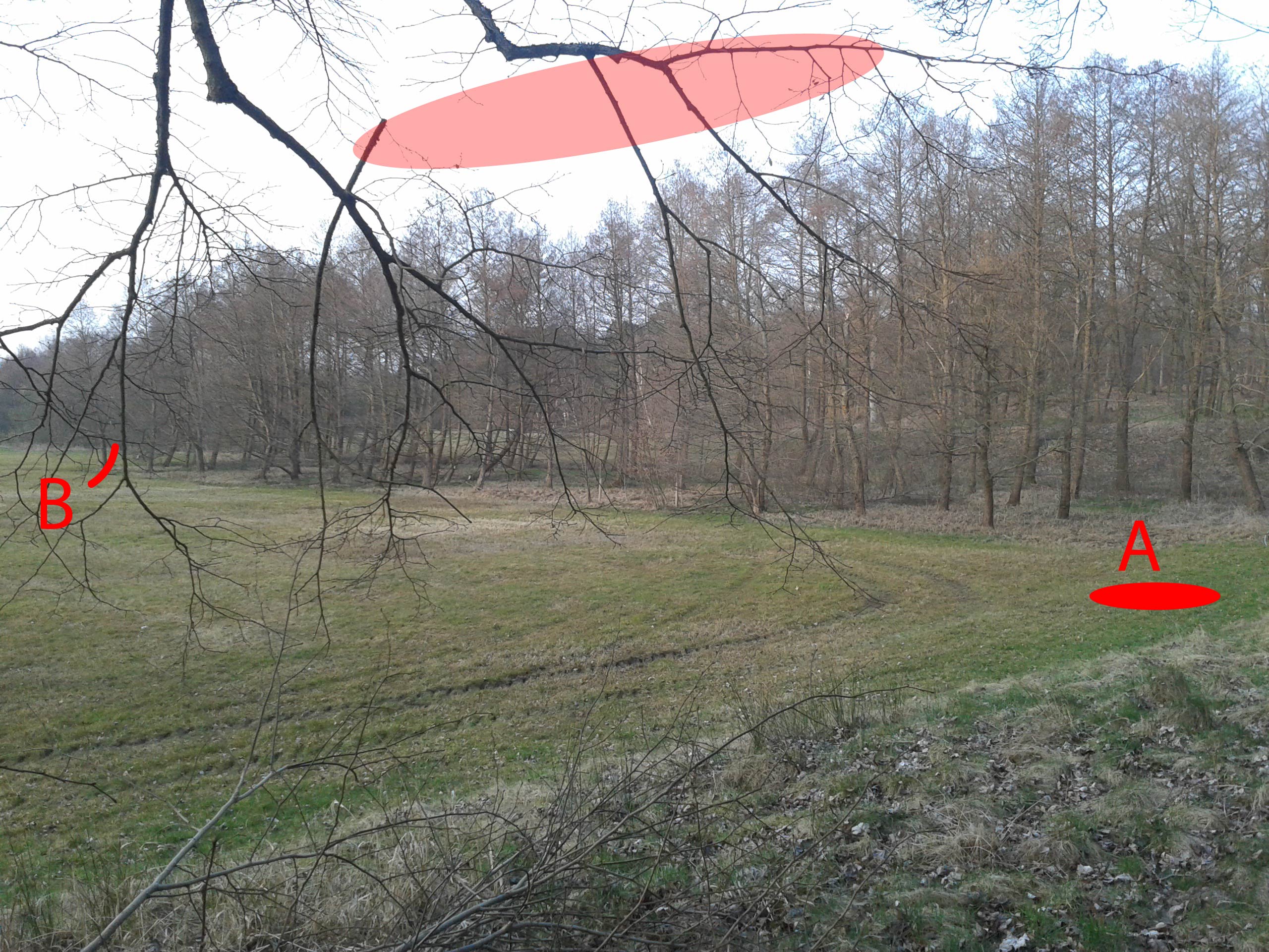 Wenn ich von Punkt A (wo ich sitze) losfliege zu Punkt B (hinter die Bäume) oder wenn ich irgendwo am Kreis über die Bäume gehe, ist das Signal fast weg, und ich bekomme fast nur Bildrauschen.