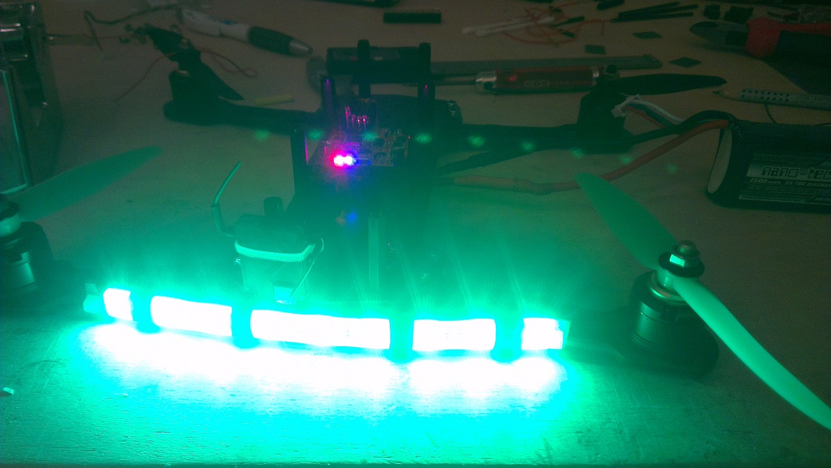 Ich hab mir aus einem alten Ordner 150x10mm ausgeschnitten, ein bisschen gebogen, die 5050 LED-Leiste in Grün aufgebappt und mit Schrumpfschlauch gesichert, 2 Löcher rein, fertig.