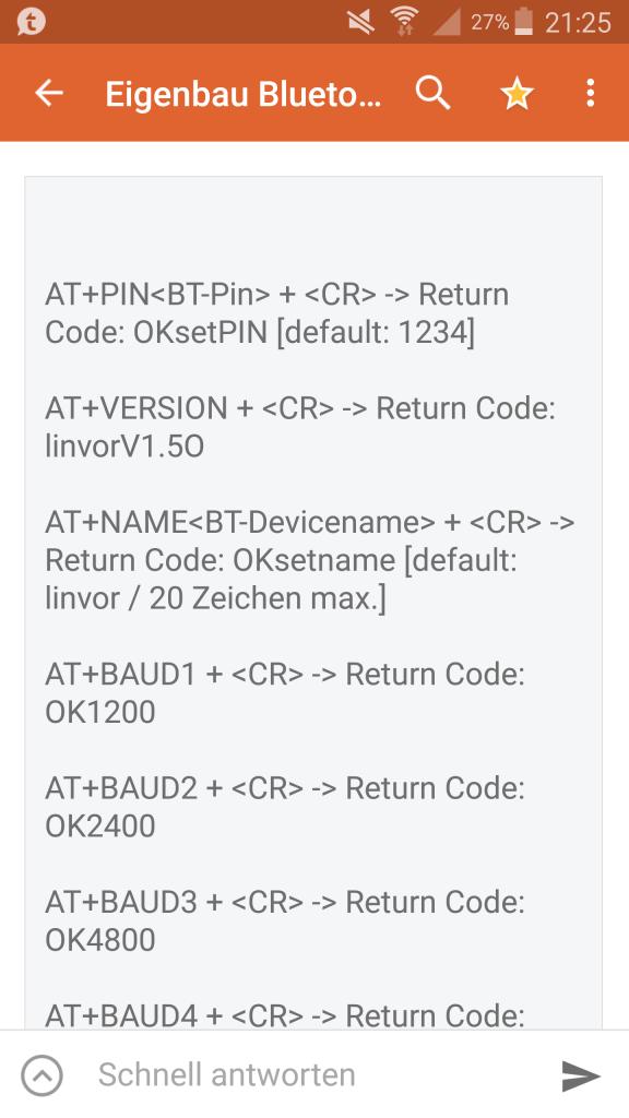 Ja, Baud8 (=115200 war richtig) jetzt wo Du es sagst.Zitat von fftunes Beitrag anzeigenHey supi vielen Dank! Hatte erst Schwierigkeiten, dann durch 'rumprobieren herausgefunden dass das HB02 mit 115k funzt