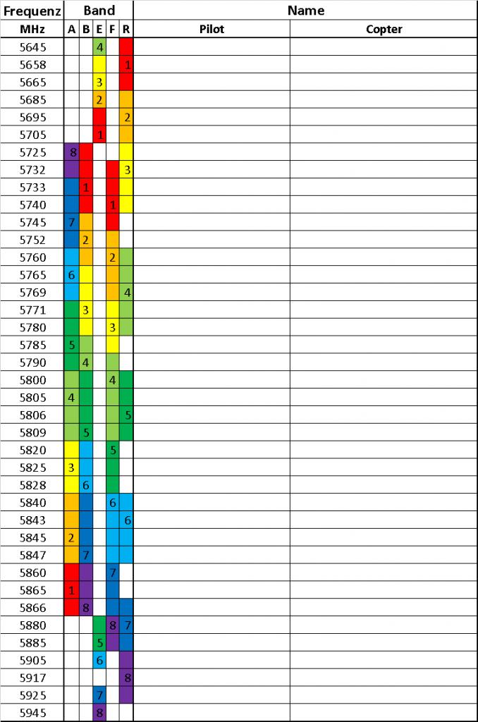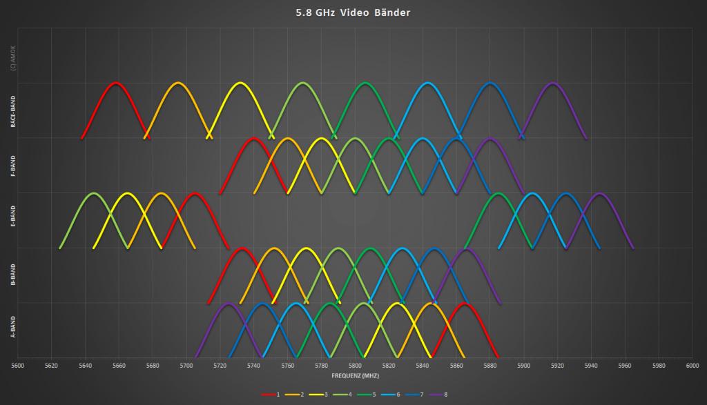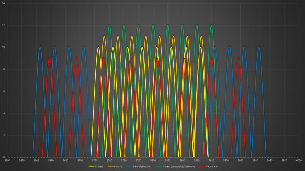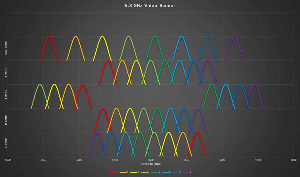 Das (in Deutschland nicht zugelassene) E-Band liegt komplett ausserhalb der anderen Bänder, so wie auch 4 der 8 Kanäle im Raceband (1,2,7,8) wobei dann folglich die anderen 4 Kanäle (3,4,5,6) wieder exakt in den anderen Frequenzbereichen liegen.