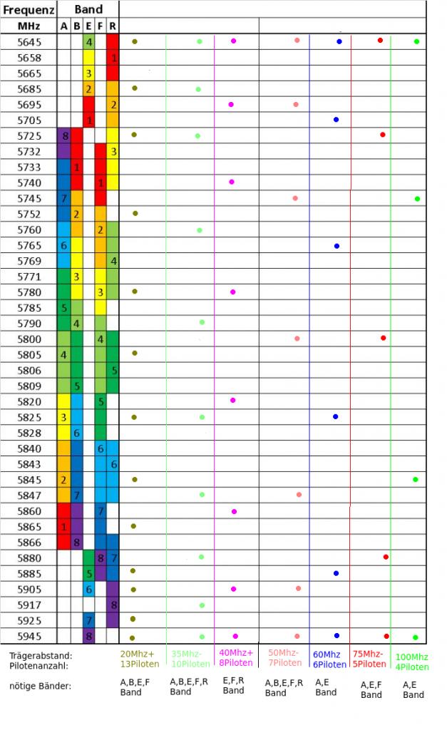 Es geht letztlich nicht um die BandKanäle, sondern um den Frequenzabstand zwischen den Trägern. Ich hab mal in der Tabelle von Amok rumgeschmiert. Ich hoffe die Kanalfrequenzen sind da korrekt.