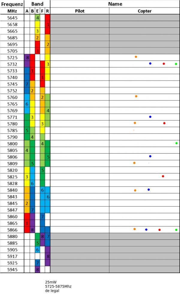Und das ganze nochmal streng Deutsch-legal. Bei mehr als 5 Piloten wird es ganz schnell eng auf dem Band. Denn ganz unten und ganz oben muß man ja eigentlich auch noch etwas Platz lassen, damit die Nebensignale nicht schon in den Sperrbereich rutschen. Bei nur 25mW sollten die Nebensignale aber eh nicht mehr so breit ausfallen. Hier werden dann die 25mW-VTX mit den geringsten Nebensignalen interessant.