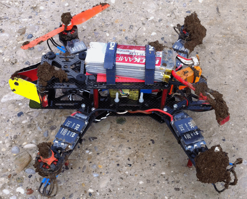 Schon paar nette Flüge absolviert (auf Sicht, da noch kein FPV). Der gelbe Papageienkopf, so dachte ich, würde für gute Lageerkennung sorgen.