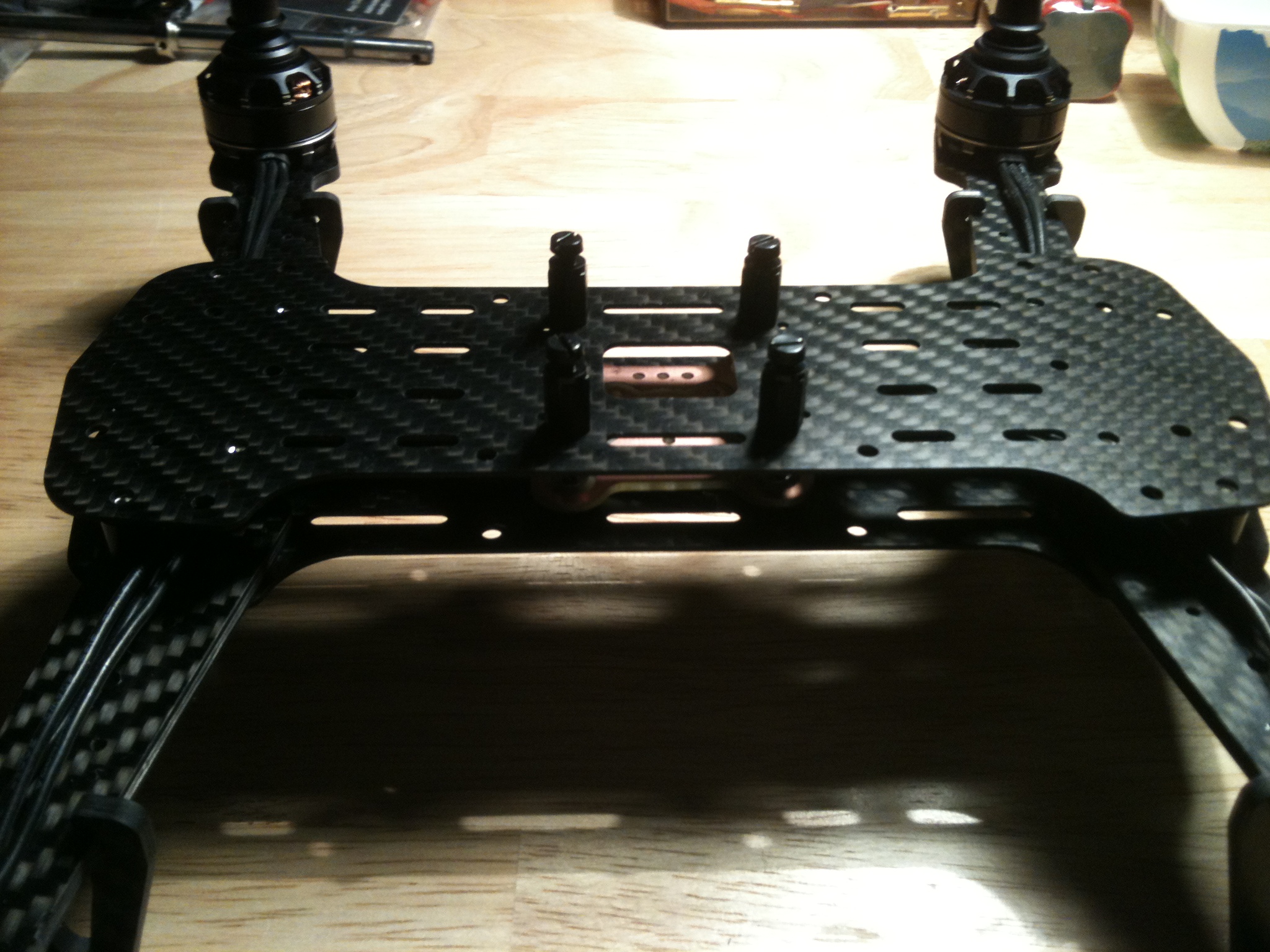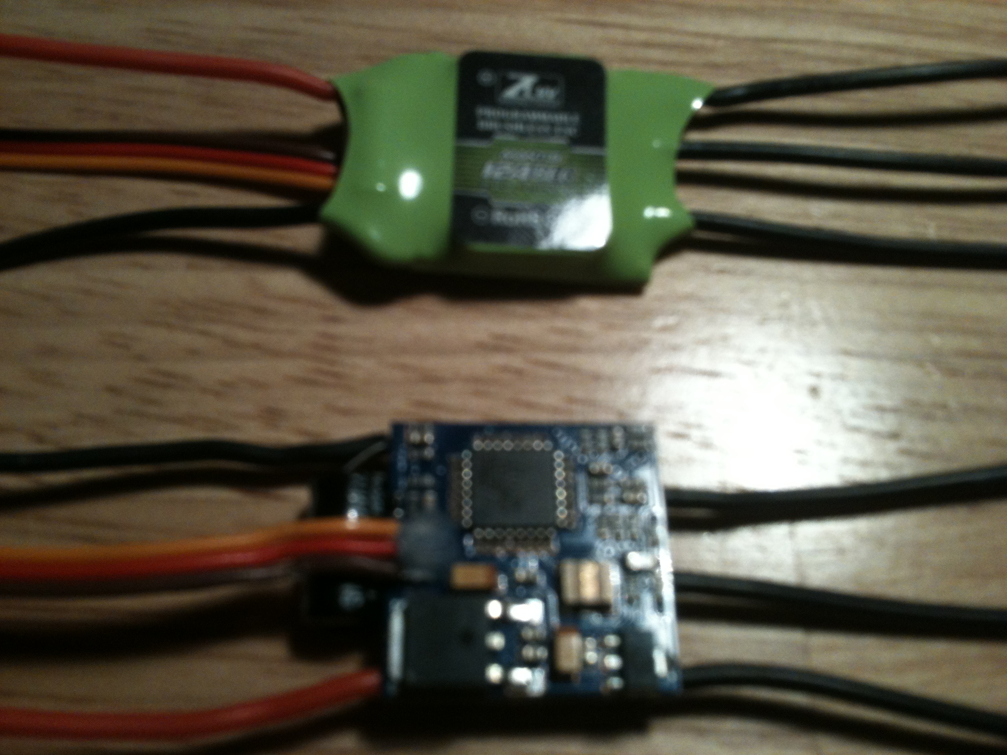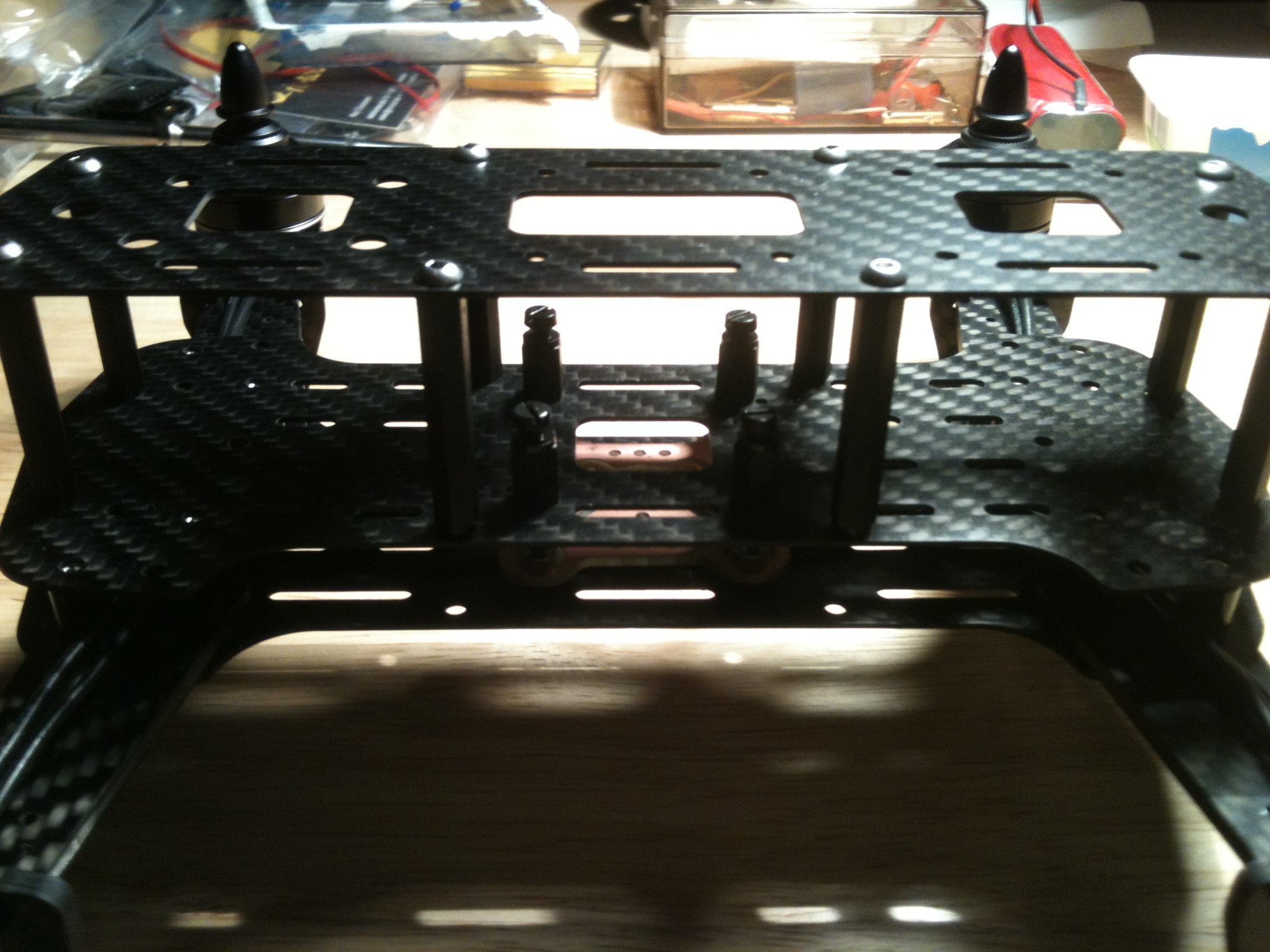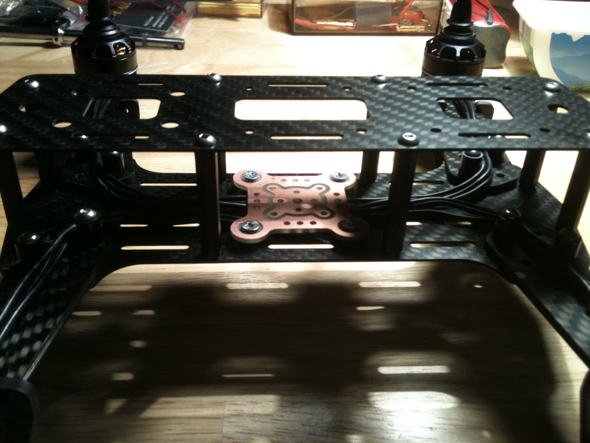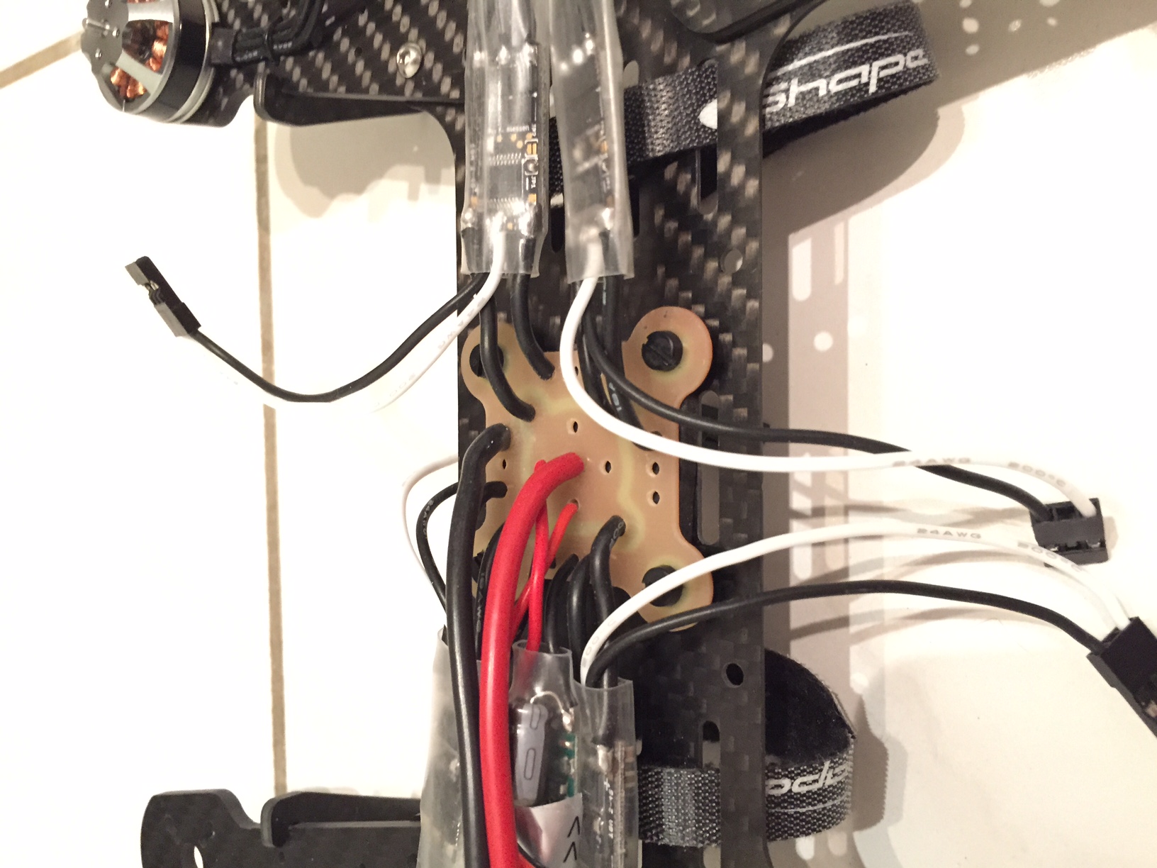 meine esc (12a simonk) passen genau dazwischen, da wo ihr die kabel der motoren in die unterseite des pdb laufen seht, da gehen die anschlüsse für das esc rein.