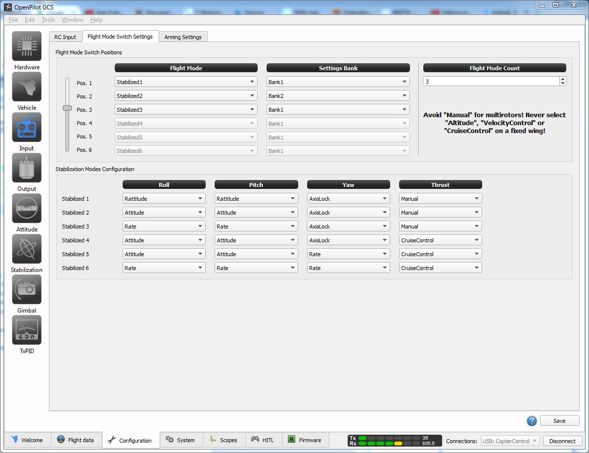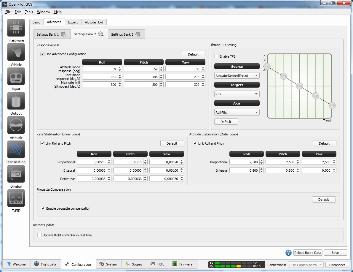 Bei den Sendereinstellungen habe ich als Besonderheit für den Attitude Mode eine 2te Bank benutzt. Da habe ich den I Anteil in den ßußeren Loop geschrieben, außer für YAW. Er wackelt jetzt auch auf Roll viel weniger wenn man senkrecht Höhe verliert.