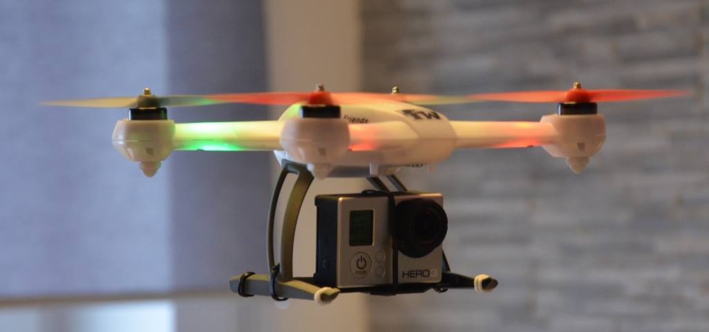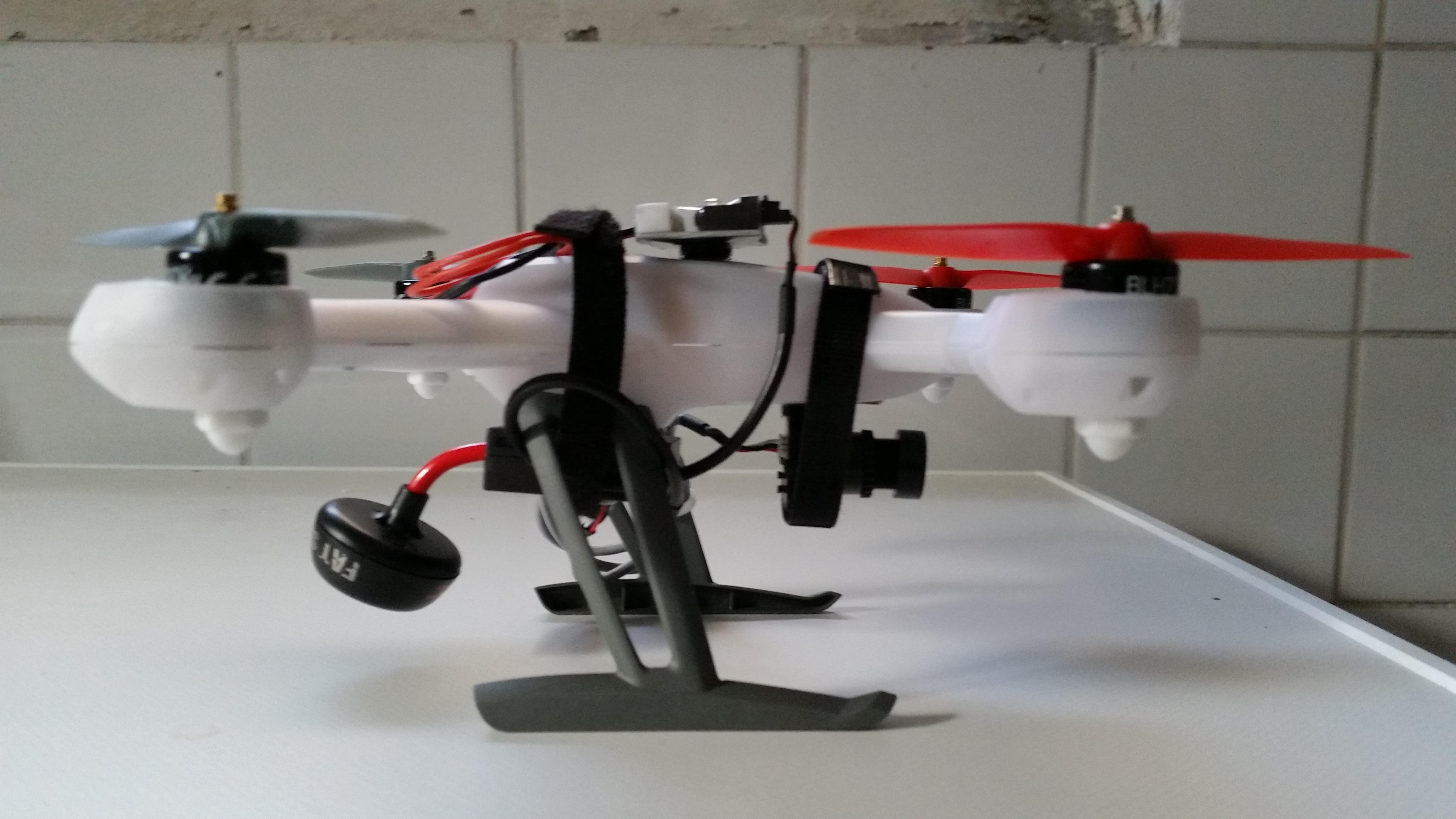 Da ich den Copter als Kameraträger verwenden möchte, zumindest als Versuchsobjekt, bis ich glaube einen großen Copter haben zu müssen, habe ich mir eine Mobius Actioncam gekauft. Das Teil wiegt betriebsbereit 40 Gramm. Um die Cam zu befestigen, habe ich weichen Schaumstoff aus einer alten Verpackung verwendet. Zurechgeschnitten und mit Uhu Por zusammengeklebt und mit Gummiband an den Landebeinen befestigt. Die Idee dabei: möglichst kein zusätzliches Gewicht UND eine Dämpfung gegen den Jello-Effekt. Ein echter Flug damit steht noch aus, aber ein erster kleine Testflug im Zimmer war schon mal recht vielversprechend. Der 200 QX hebt bei ca. 50% Knüppelstellung ab und liegt noch ruhig in der Luft. Auf der Aufnahme konnte ich absolut keinen Jello-Effekt erkennen, weder in der Startphase, noch im Flug. Sollte das wirklich so einfach sein?! Man wird sehen.