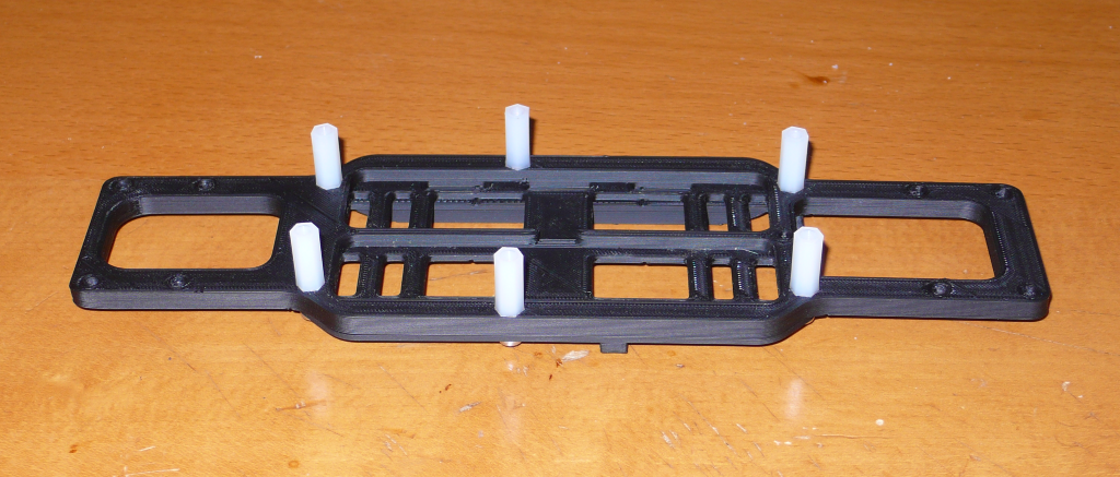 Die Platten werden mit 15mm hohen Nylon Distanzhaltern (mit M3 Innengewinde) aneinander geschraubt.