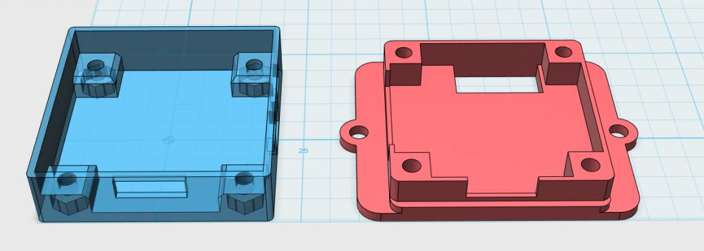 Das Frame soll aus zwei Platten bestehen, die für die Aufnahme der Komponenten und die Festigkeit verantwortlich sind. Auf dem Bild sind auch noch die Akkuhalterung und der Befestigungswinkel für die Runcam Sky ersichtlich.