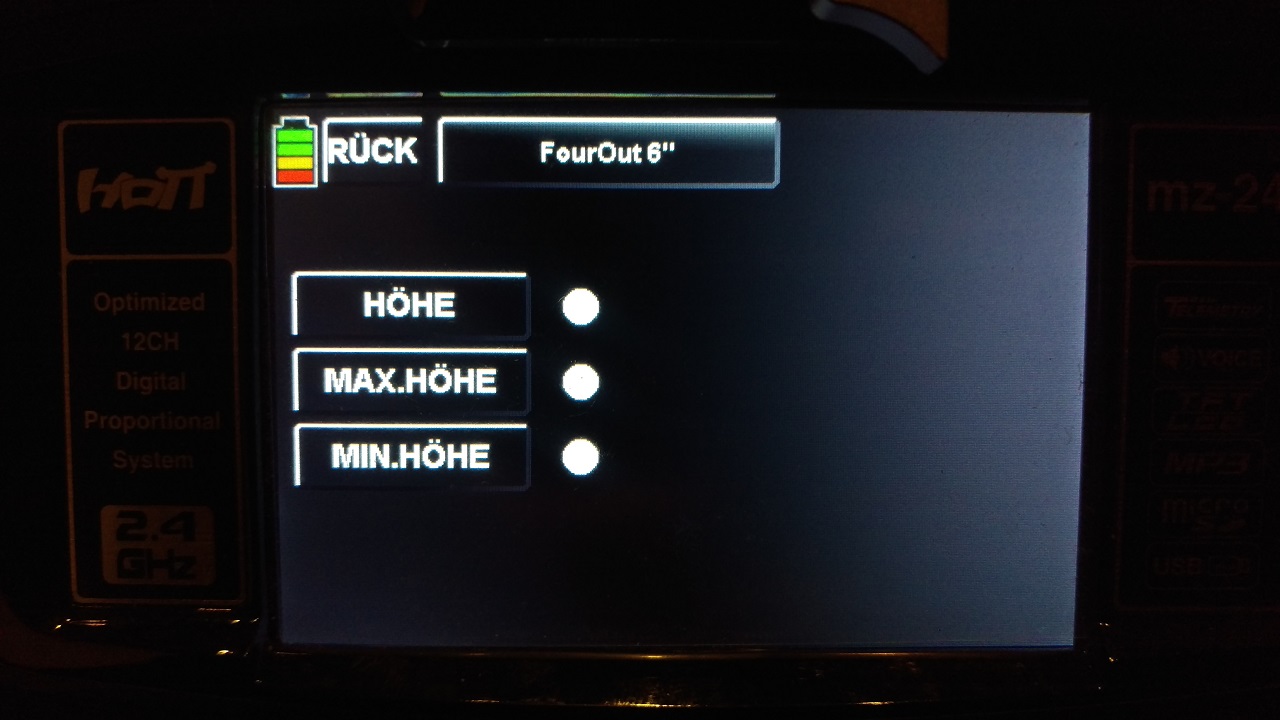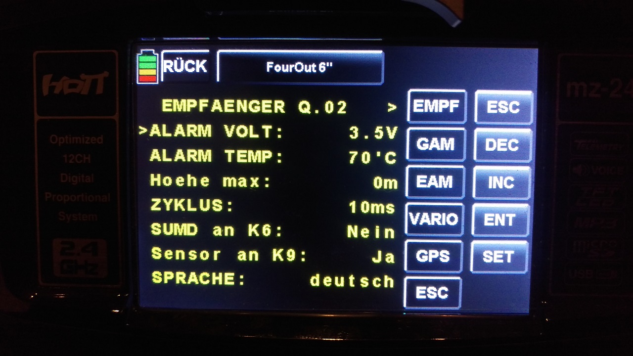 Hallo, brauche mal Eure Hilfe zum GR18.............bin mir nicht darüber im Klaren wie ich Drehrate und Expo etc. einstelle. Ich finde die Felder zwar im Menu aber die Werte sagen mir nichts? Wo gibt es hierfür evtl. eine gute anschauliche Erklärung?Zitat von MartinSausF Beitrag anzeigenAlso das Freestyle-Video ist echt gut geflogen! Das ist sicher eine deutlich höhere Drehrate um die Hochachse als ich sie zur Zeit fliege. Aber ich werde eh demnächst auf 4S aufrüsten und mal mit 150% Servoweg testen. Mal sehn, ob man dann ähnliche Drehraten erreicht. Für Racing brauche ich allerdings keine so hohe Drehrate bei Gier, da ich tatsächlich um enge/schnelle Kurven mit Roll und Nick rumfliege (wie morningstreet schreibt). Sonst trägt es einen ja total aus der Kurve und/oder man verliert viel Speed! Im Parkhaus ist das doch sicher auch ein Problem mit dem Raustragen aus der Kurve oder? Da sind die Wände sicher recht schnell da!? Aber mit der "natürlichen Höhenbegrenzung" ist das sowieso eine interessante Herausforderung