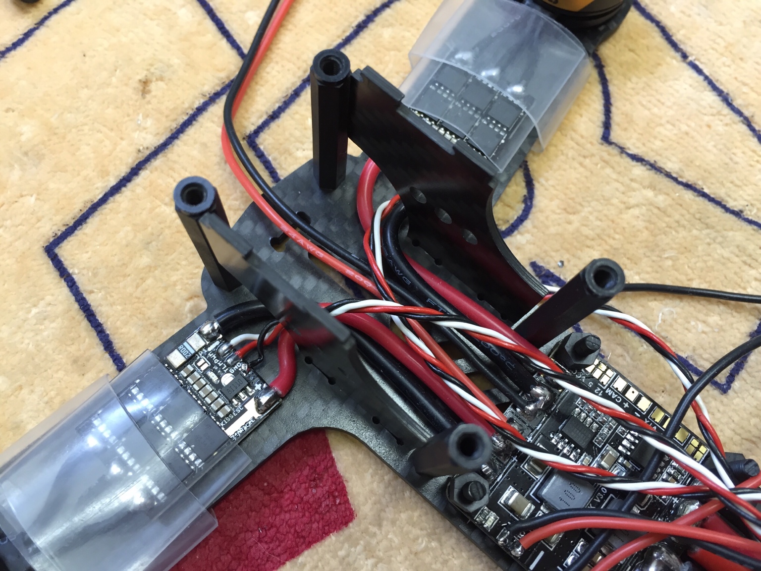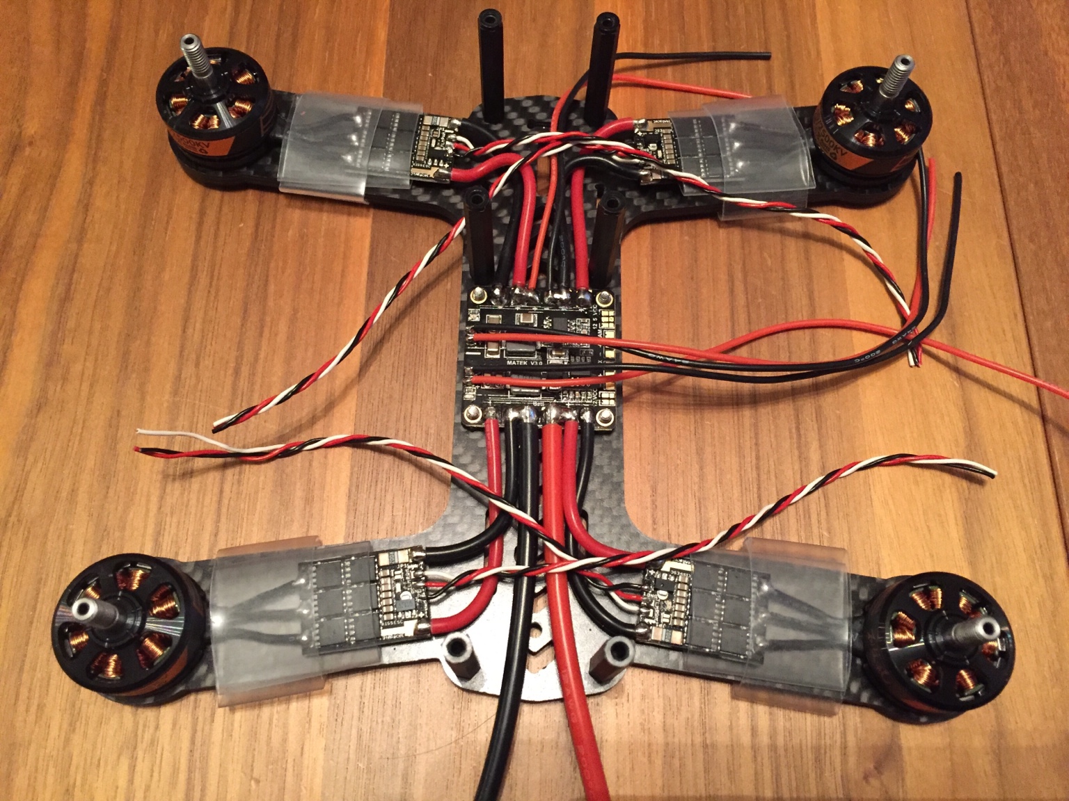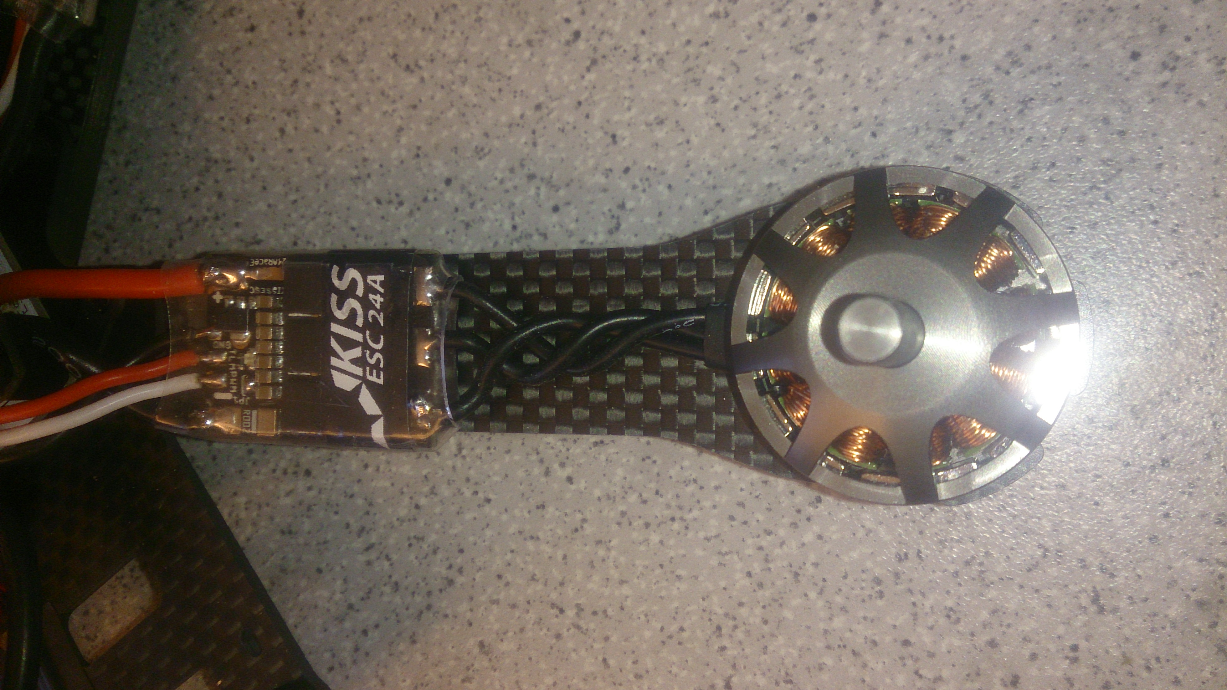 Was ich noch nicht weiß ist ob das mit den Schrumpfschläucchen zum Befestigen der KISS hinhaut. Die KISS selbst könnte ich noch nicht einschrumpfen, weil ich erst noch die Drehrichtung er Motoren prüfen muß. Aber wahrscheinlich kann ich nicht die KISS einschrumpfen ohne den "Befestigungsschrumpfschlauch" gleich mit zu schrumpfen...mal sehen...ist halt das Problem bei einteiligen Frames und fest verlöteten Motoren