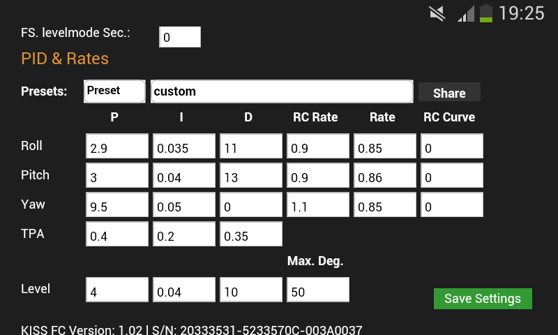 Mir ist schon klar, dass jeder Quadrocopter sehr individuell ist und deshalb seine eigenen Einstellungen braucht, daher bitte keine Kommentare dazu.