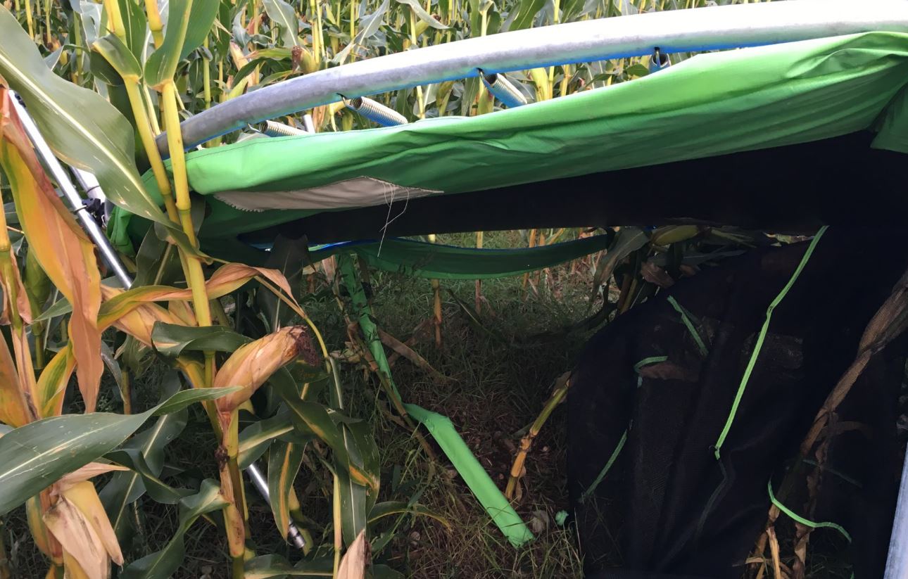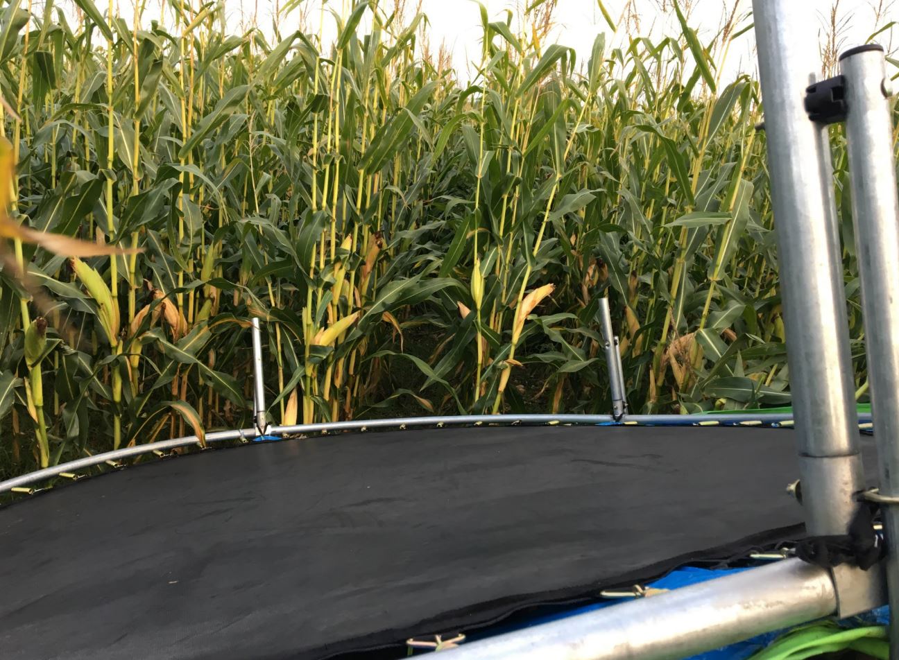 Das Trampolin unserer Nachbarsbuben wurde gestern Nacht beim Sturm/Gewitter trotz Verankerung aus dem Garten heraus auf eine Wiese und anschl. Richtung Maisfeld und angrenzenden Wald gepustet.