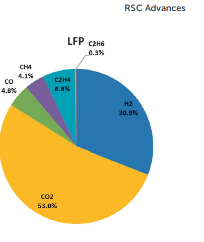 Hier mal die ermittelten Komponenten aus einem Forschungsvorhaben. Die LiFP-Zelle wurde beheizt und somit ein Thermal Runaway ausgelöst. Wenn der entstehende Wasserstoff mit Flour-haltigem Elektrolyt reagiert entsteht Flußsäure. Dann hast Du den Supergau. Da hilft auch ein einfaches Geflecht in dem Bat Safe nichts.