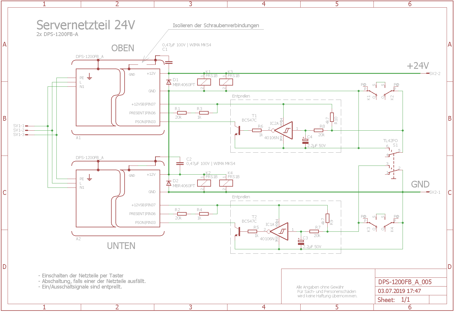 Ich habe mir nach Euren Empfehlungen zwei DPS-1200FB-A (60 €) gekauft und in Reihe zu 24V am Ausgang verschaltet. GND ist mit der Erdung verbunden. Die Netzteile werden per Taster eingeschaltet und stoppen, falls einer von beiden Ausfällt. Dioden zum Schutz und Kondensatoren zur Glättung sind vohanden. Die Lösung hat sich zum Teil daran orientiert, was da war.
