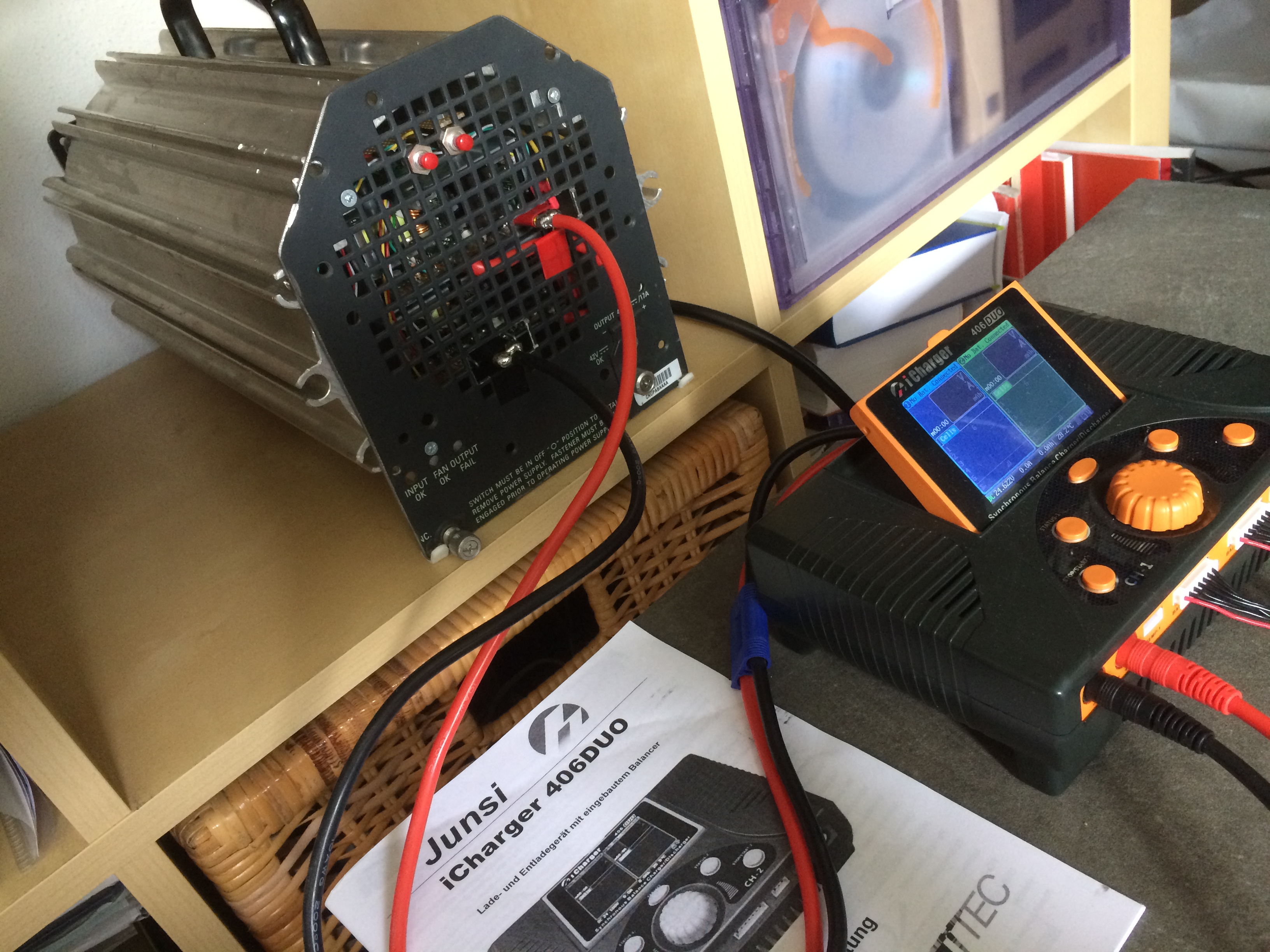 Zum Laden der LiPo's habe ich mir einen Chargery S1500 (V2.1) und einen 406DUO bestellt. Geliefert wurde leider eine Version 2.0 des Chargery S1500. Dieser hat 5 min mit dem 406DUO funktioniert (Einstellung: 24V am S1500 Ausgang, 60A max). Ich habe mit dem 406DUO eine Quantum 2200mAh 3S mit 0.5C kurz angefangen zu laden. Alles bestens. Dann den Ladevorgang gestoppt, Akku abgesteckt, NT ausgeschaltet und anschließend aus der Steckdose ausgesteckt.