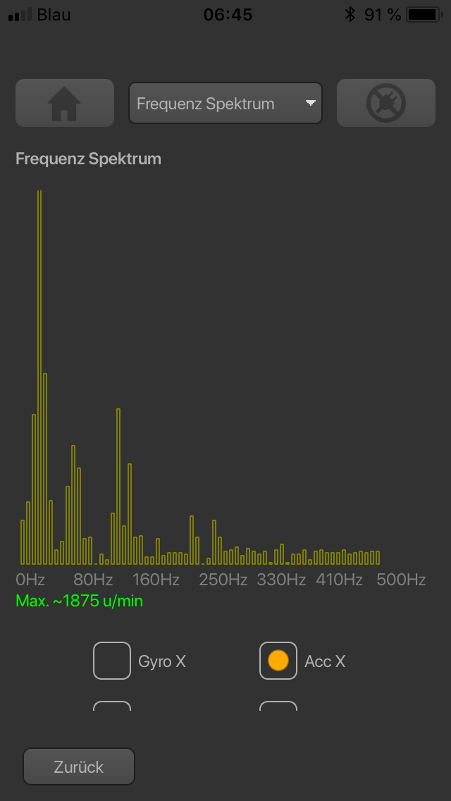 Wie auch immer, mit demontierten Heck- und Rotorblättern zeigt das Tool deutlich die Motorfrequenz. Der Motor ist eine neuer Scorpion HKIII 4035-560KV und der Regler ein Hobbywing Platinum 100A V3 mit 6S und 13 Zähnen am Ritzel--> ca 1100 ... 1350 rpm.