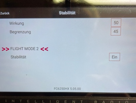 Wenn ich das über die Vorwärtsprogrammierung der IX20 mache, so ist immer nur der Flumodus 2 angegeben bei dem "Stabilität" ein- oder ausgeschaltet werden kann. Unabhängig von der jeweils eingestellten Flugphase am Sender.