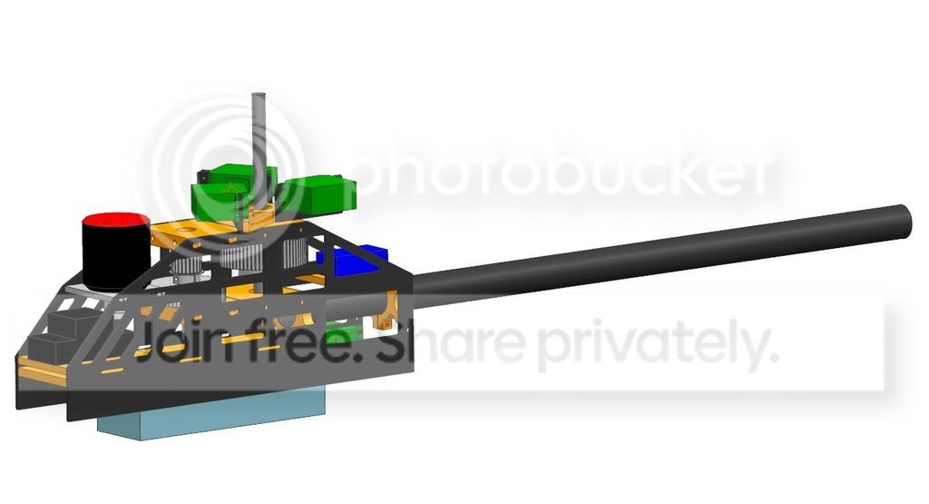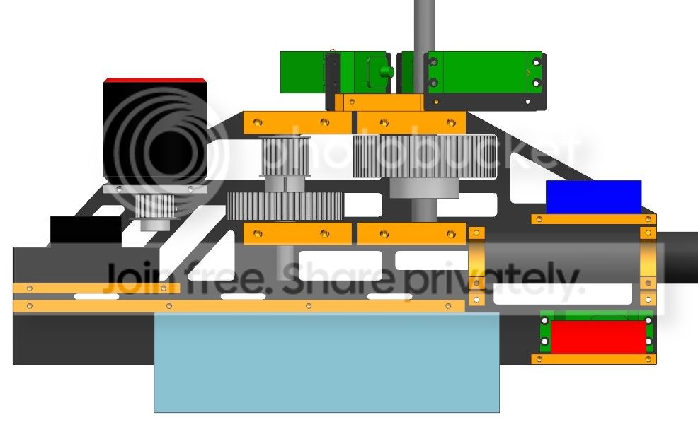 [/IMG]Die orangenen Teile habe ich mal als 3D Druck angedacht. Ob das realistisch ist, bin ich mir nicht sicher. Besonders bei den Lagerplatten für die zwei Wellen könnte Alu doch besser sein.