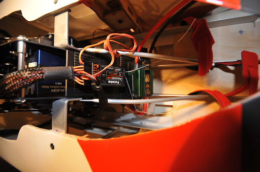 Um die Stabilität der Mechanik im Rumpf zu verbessern, sind vor und hinter der HRW Aluwinkel angeschraubt worden und zusätzlich gegen vorne zwei Alurohre bis auf die Akkuschlitten runter.