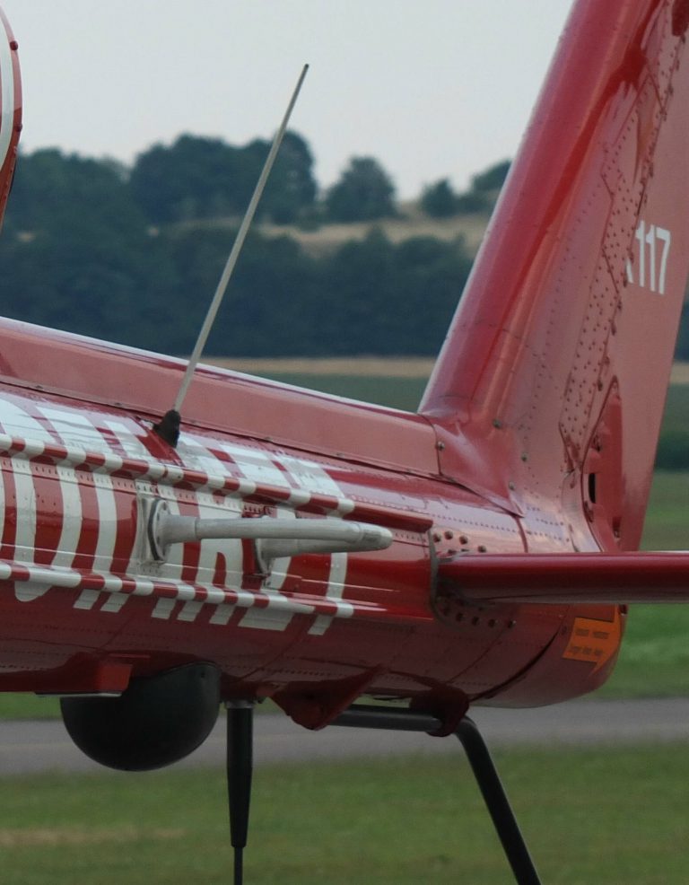 Dann bleiben wir mal auf der Höhe und schauen uns den Tailboom genauer an. Auf dem Tailboom ist bei der D-HTTT eine weitere Flugfunk-Antenne verbaut. In Flugrichtung gesehen neigt sie sich etwas nach links vom Zentrum des Tailbooms weg. Und von der Seite betrachtet ist sie Richtung Heckflosse ausgerichtet. Wie in der kommerziellen Flugzeugbranche auch, gibt es den sogenannten Flotten- oder Betreiberfunk. Also eine Funkanlage mit Frequenz wo sich zum Beispiel nur Maschinen der DRF Luftrettung untereinander bzw. mit der Leitstelle unterhalten können. Bei vielen Maschinen ist diese gern auch unten am Tailboom zusammen mit der langen und schwarzen BOS-Antenne verbaut. Hier stellt die Triple Tango wieder eine Ausnahme dar.