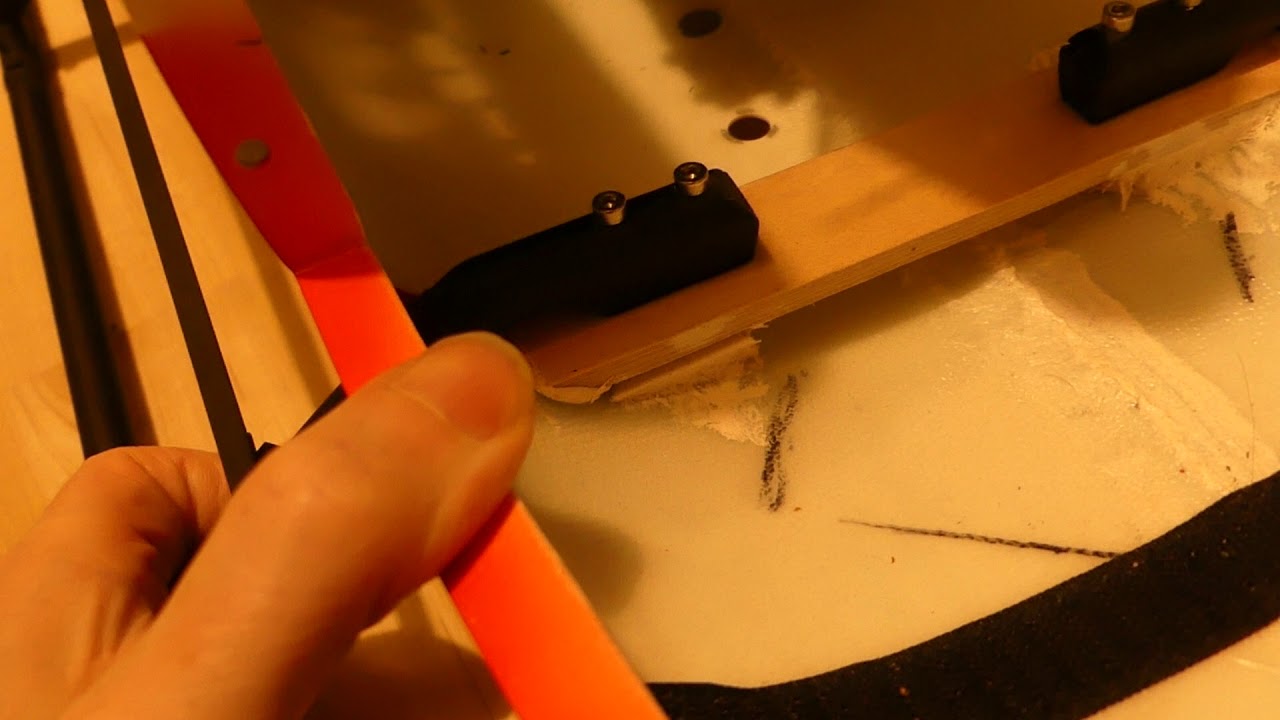 Innen hatte sich durch die Verformung die rechte Kufenbefestigung gelöst. Aber nicht flächig, sondern zerklüftet, sprich das Holz der Platte war wellig aberissen. Ein Zeichen dass die Verklebung optimal war, sonst wäre die Bruchflächig eben an der Holzoberfläche gewesen. Das konnte geklebt werden.
